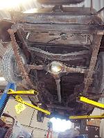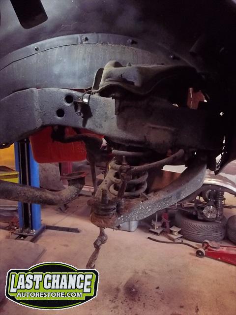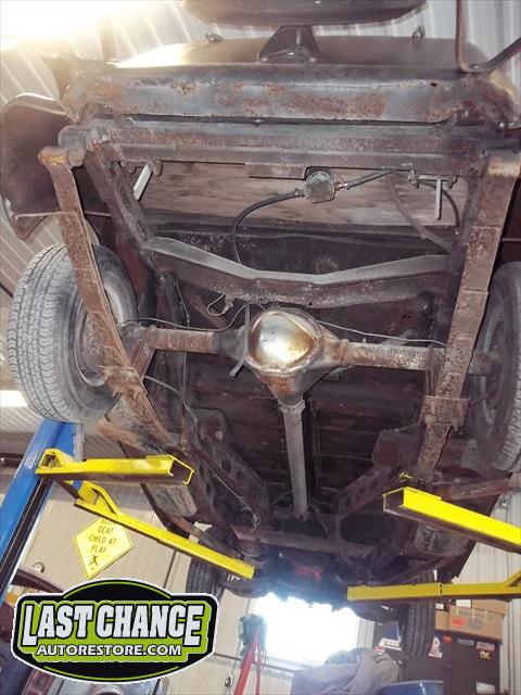 The front end is out of a 1970 Pontiac GTO (just drum brakes) along with a 1970 Chevy Camaro 12 bolt rear end assembly and leaf spring suspension. The previous owner improperly cut the front coil springs and installed unknown leaf springs without rear shocks.