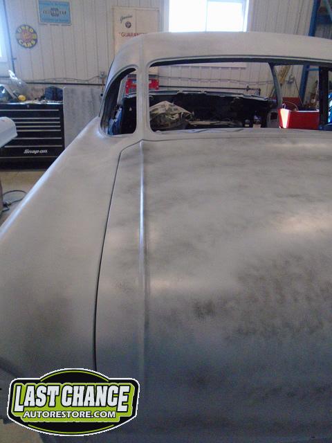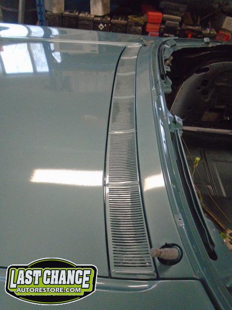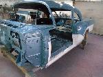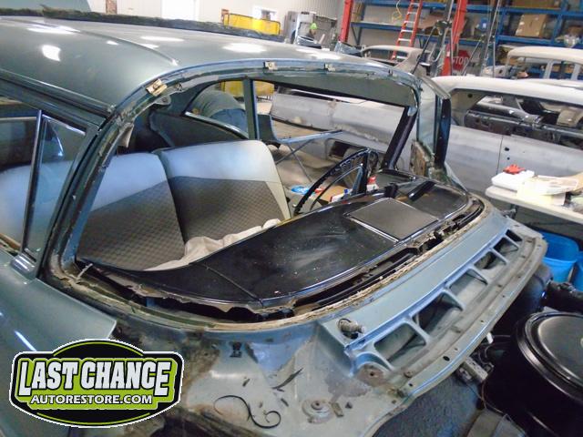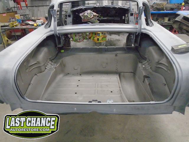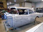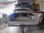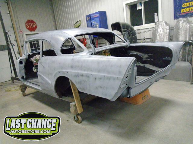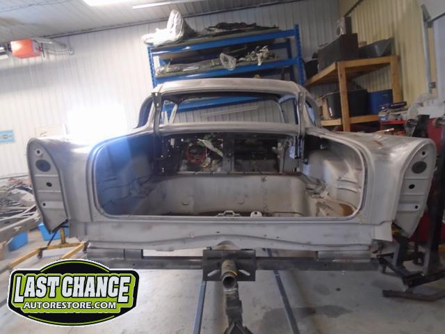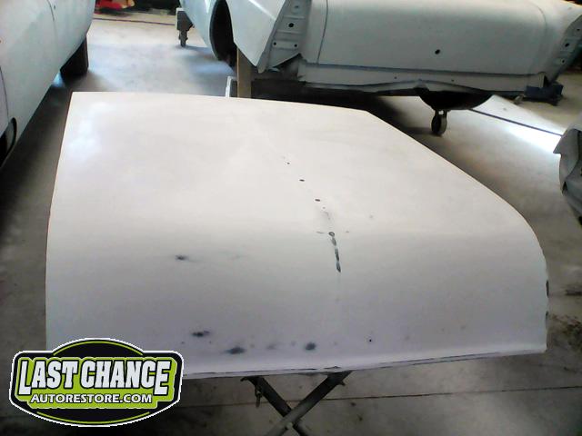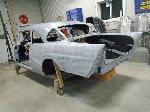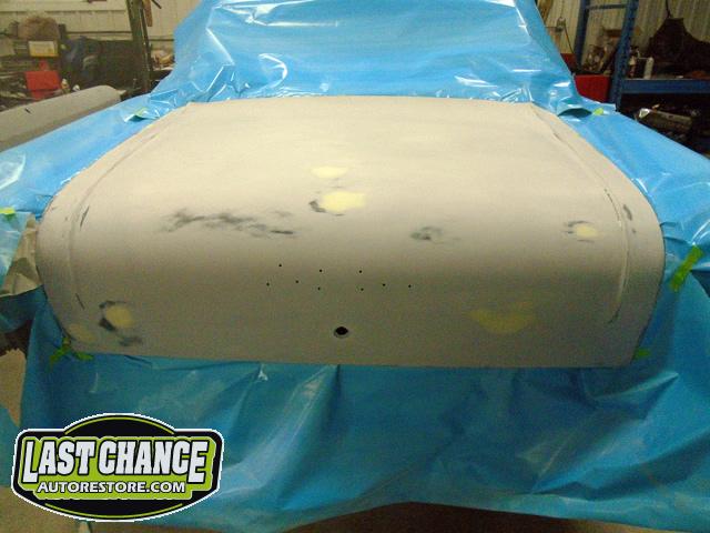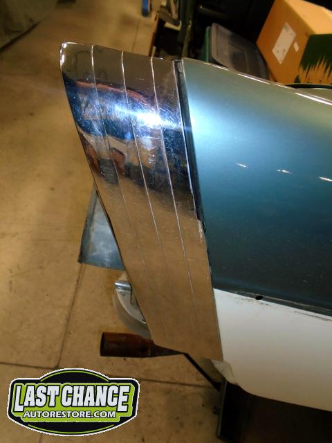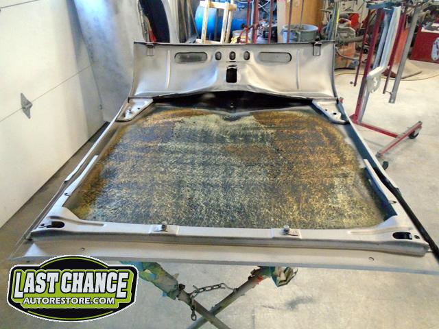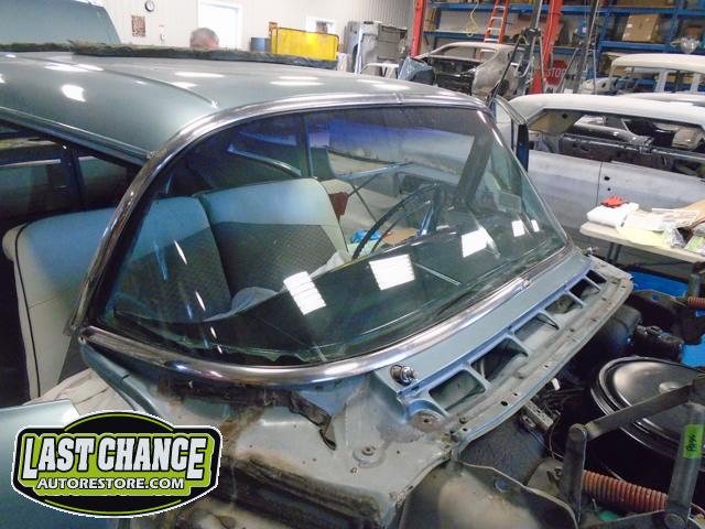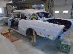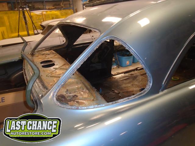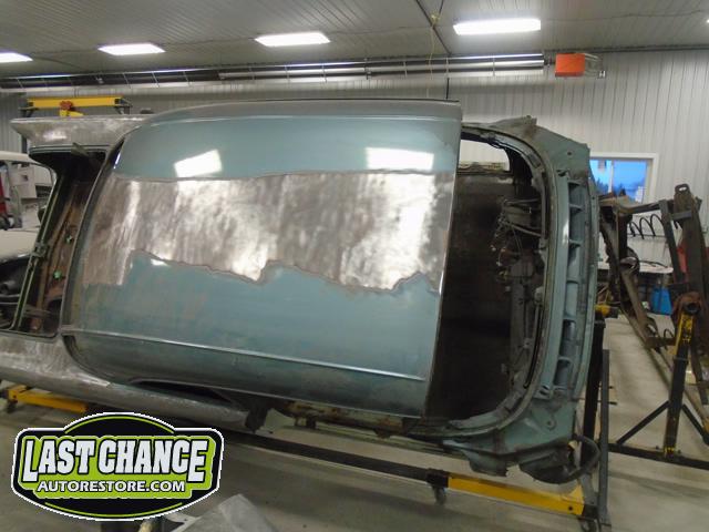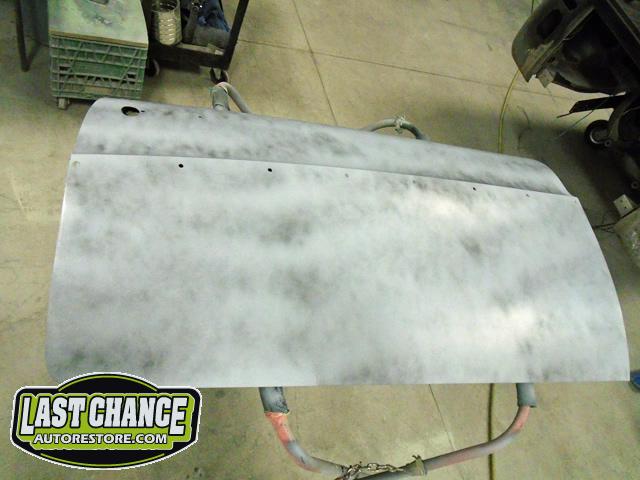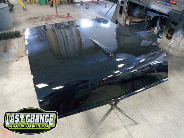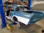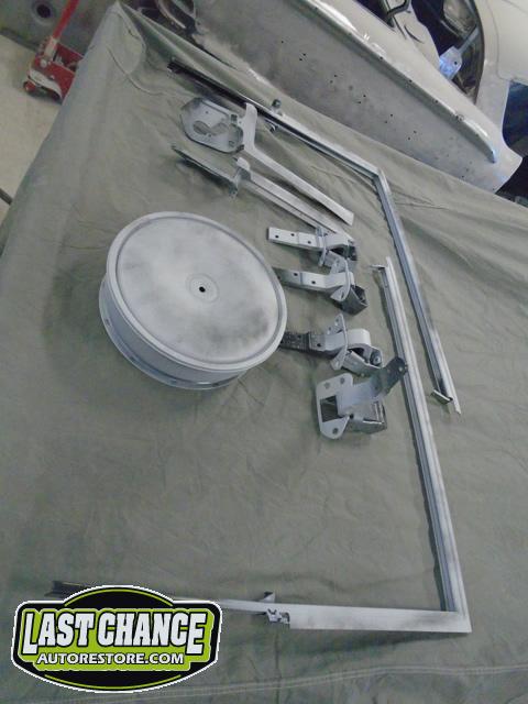 We began the restoration by removing all of the chrome trim, front and rear bumpers, hood, trunk lid, both doors and all glass.