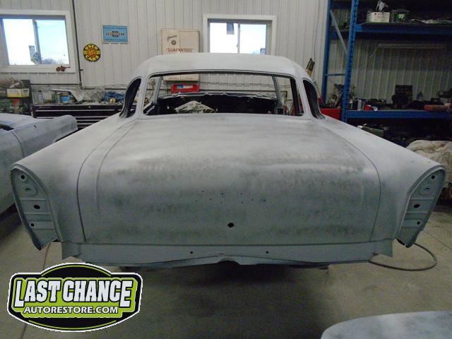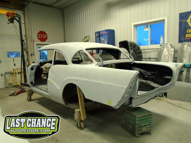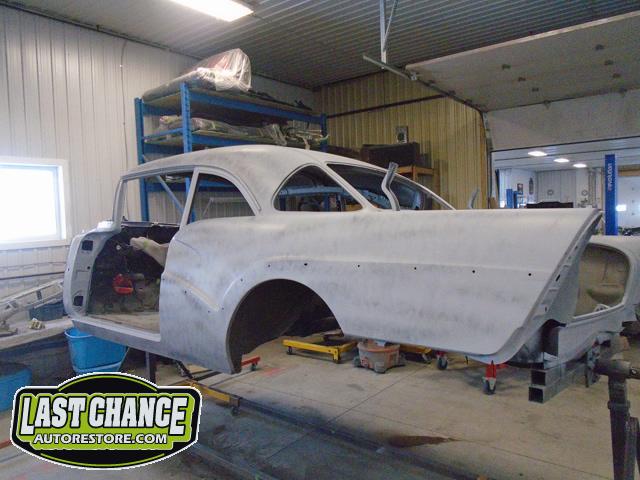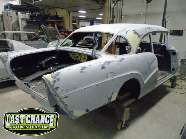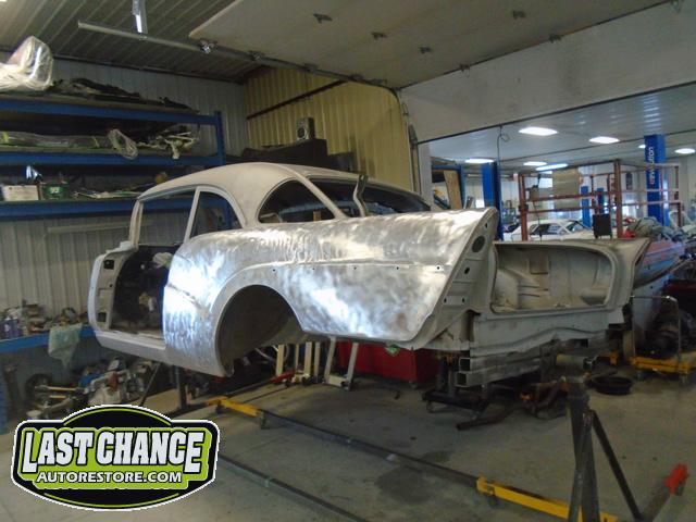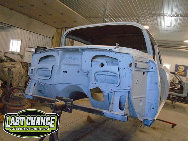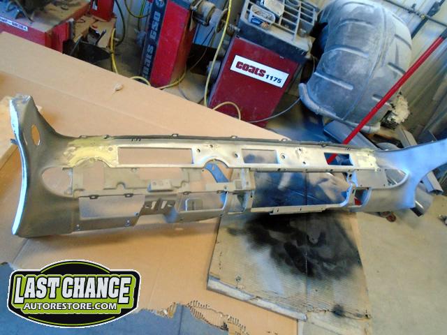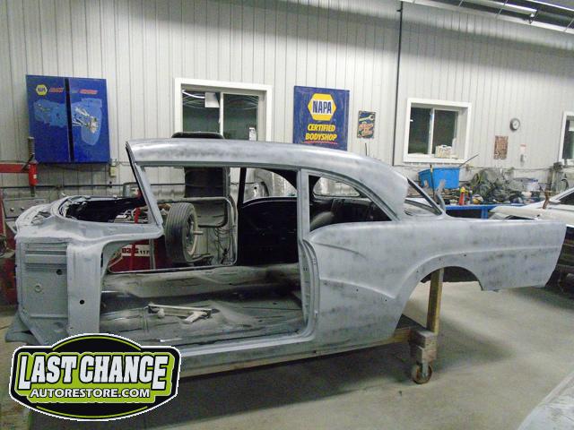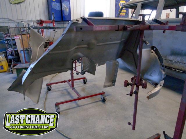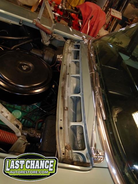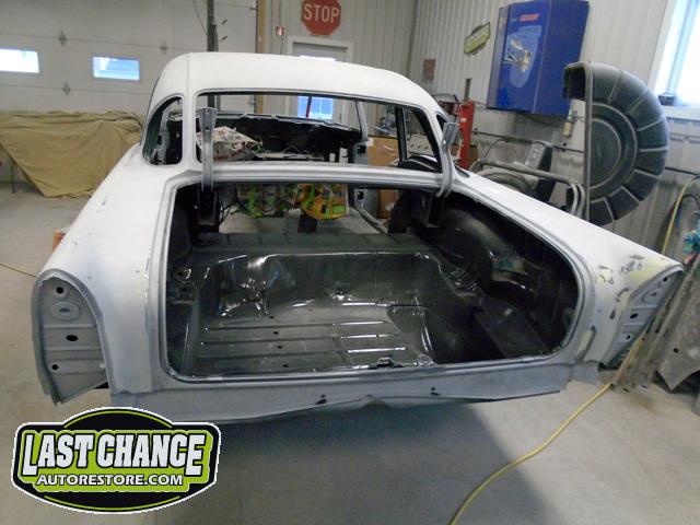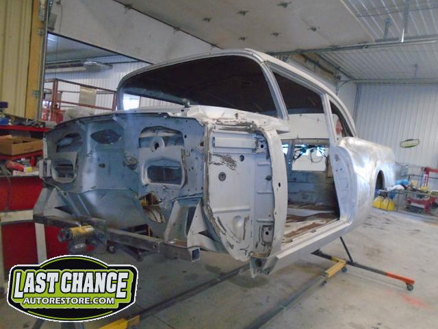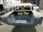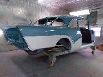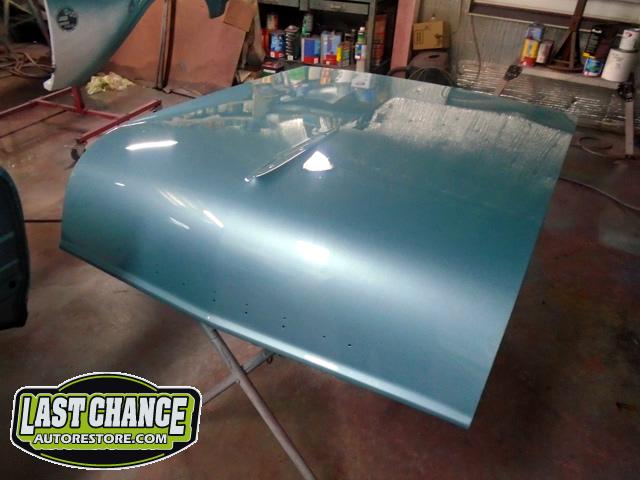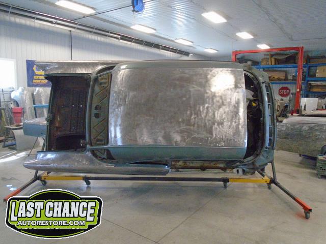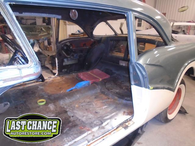 We began the restoration by removing all of the chrome trim, front and rear bumpers, hood, trunk lid, both doors and all glass.