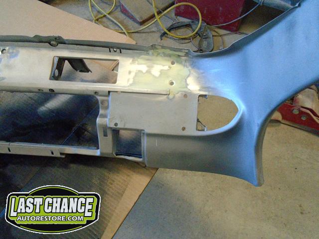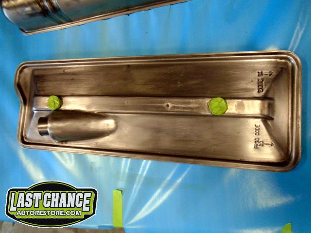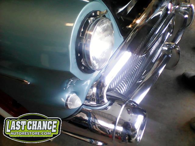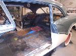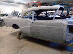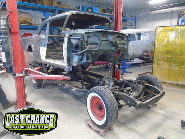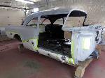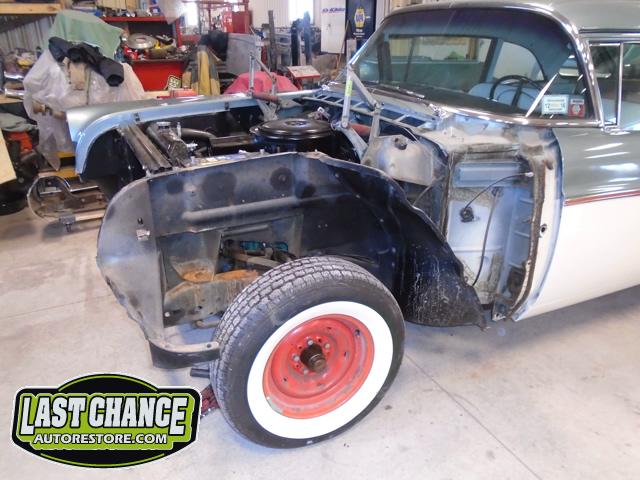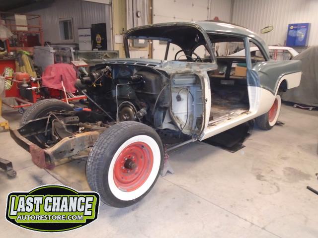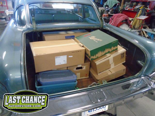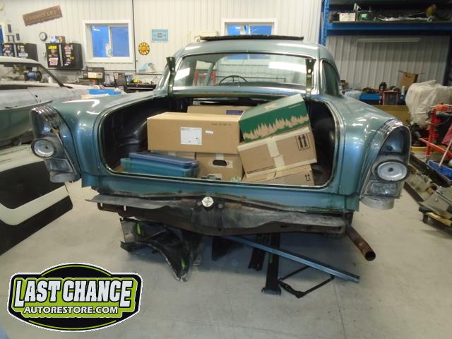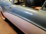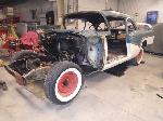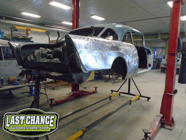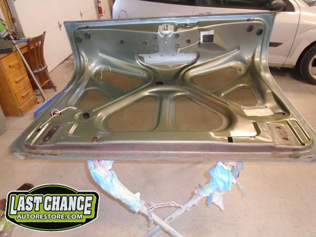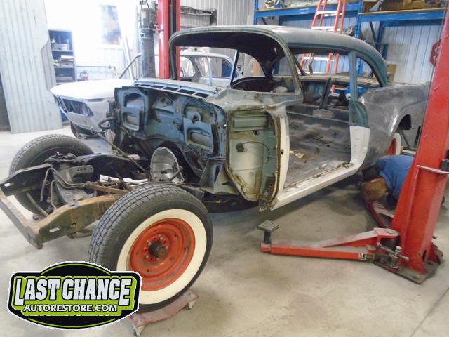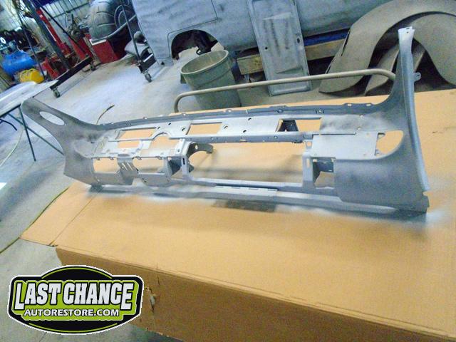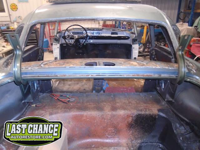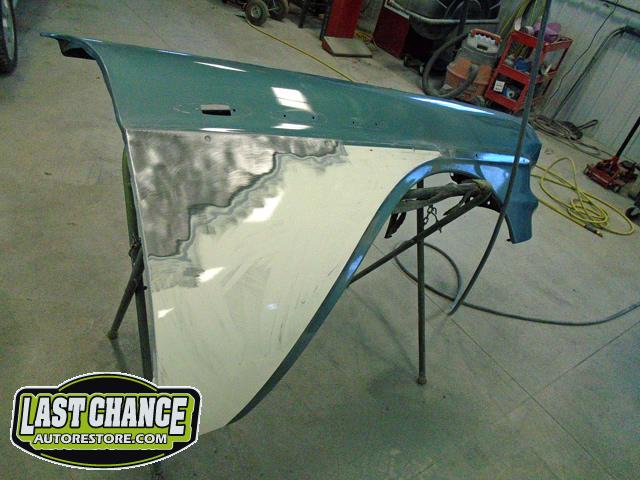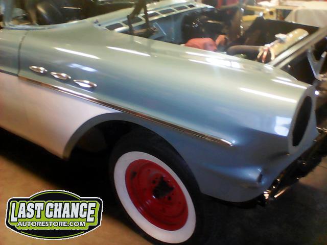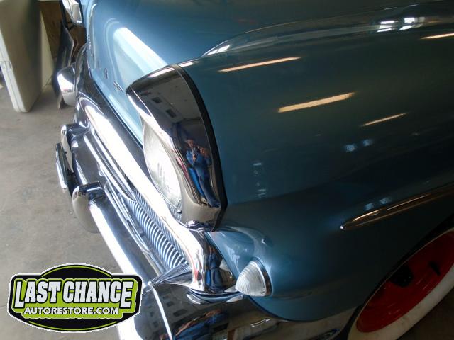 We began the restoration by removing all of the chrome trim, front and rear bumpers, hood, trunk lid, both doors and all glass.