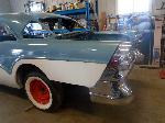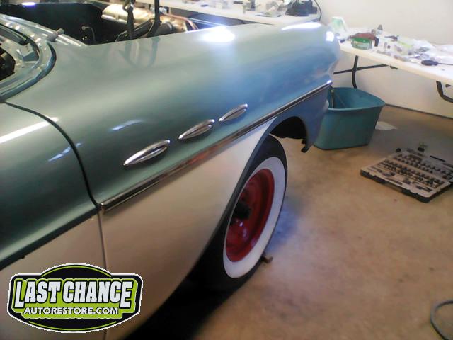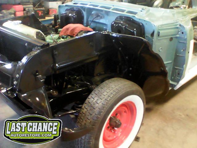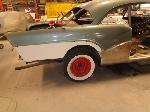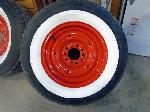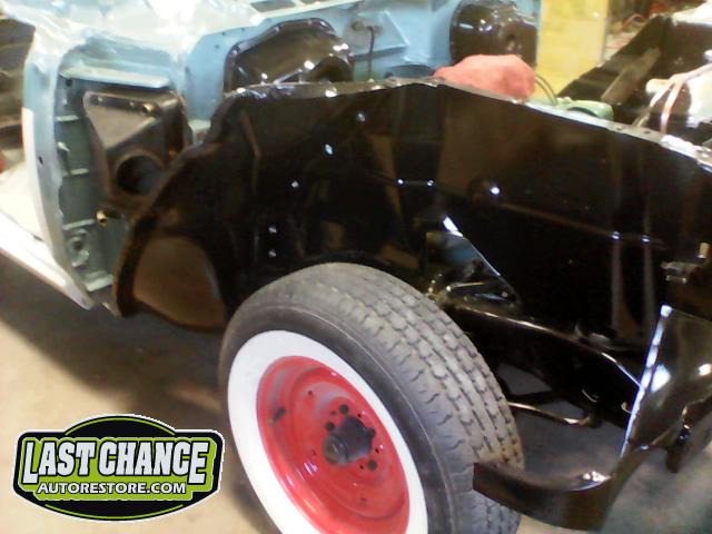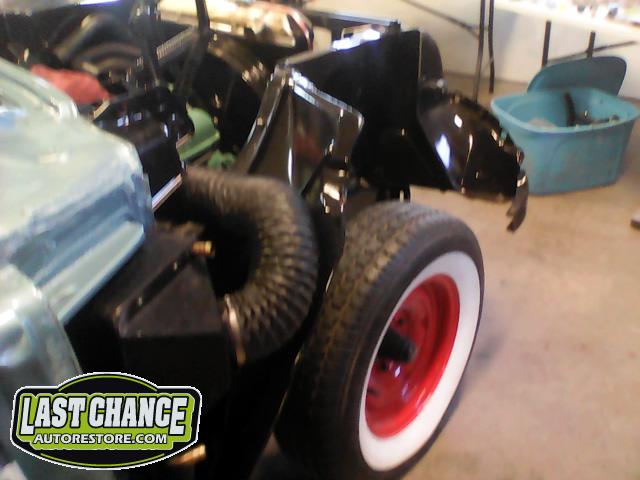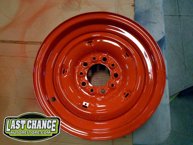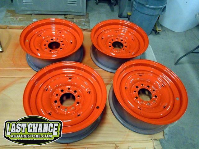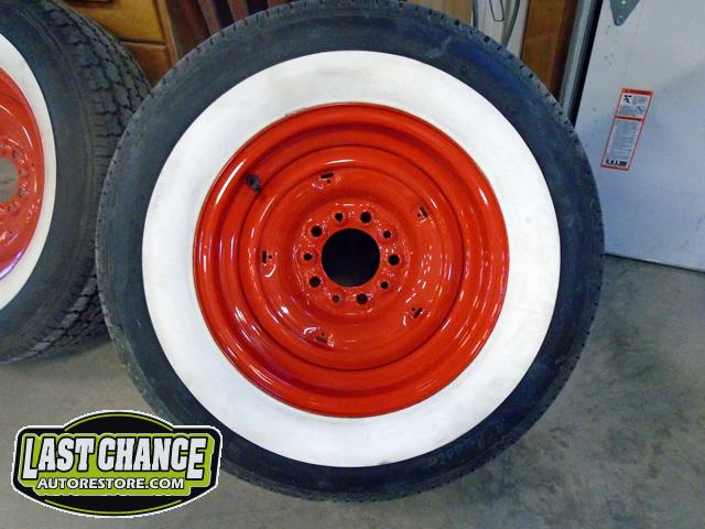 The wide white wall tires were re installed and balanced on the Tangerine painted rims before being installed onto the nicely painted chassis.