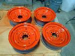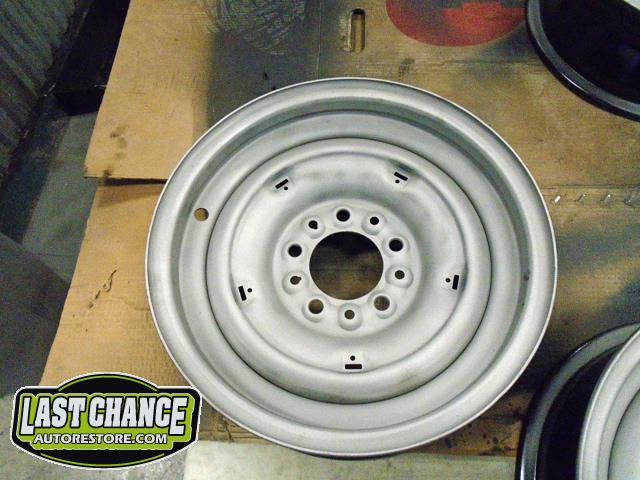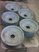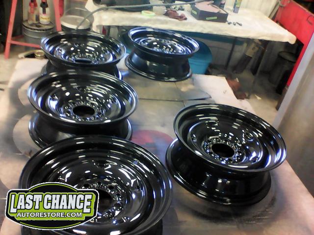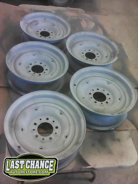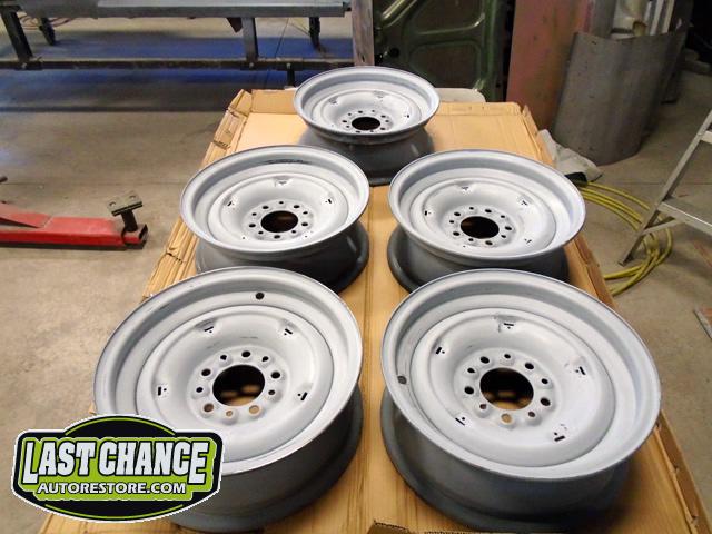 All five steel wheels received two coats of special black epoxy primer to the backsides, centers and outside rim faces before two coats of grey high build primer was applied to the front faces of all the wheels.