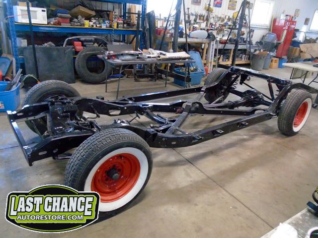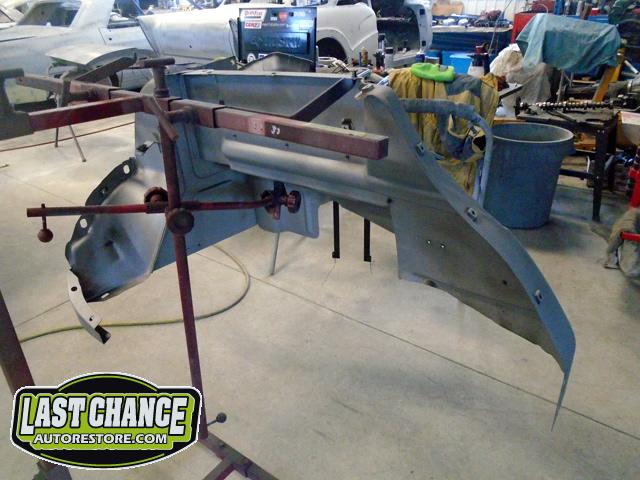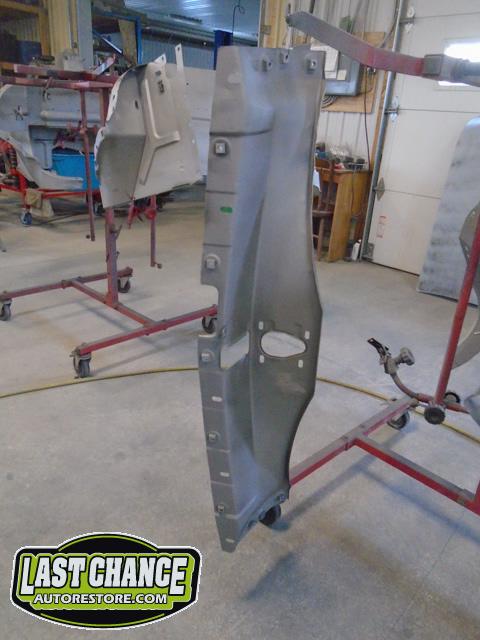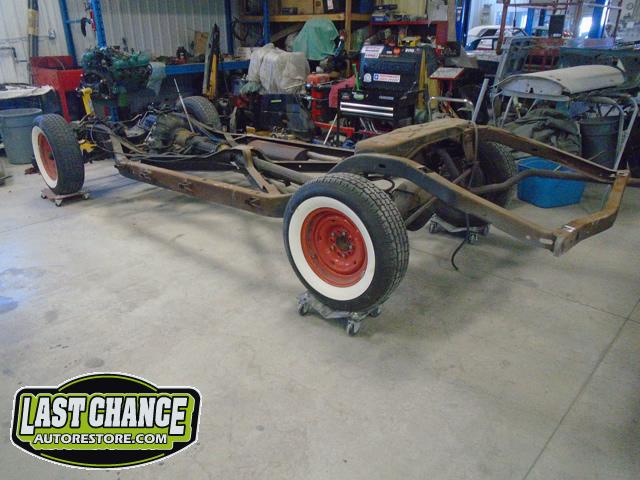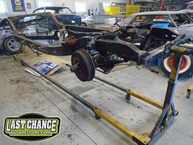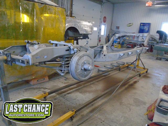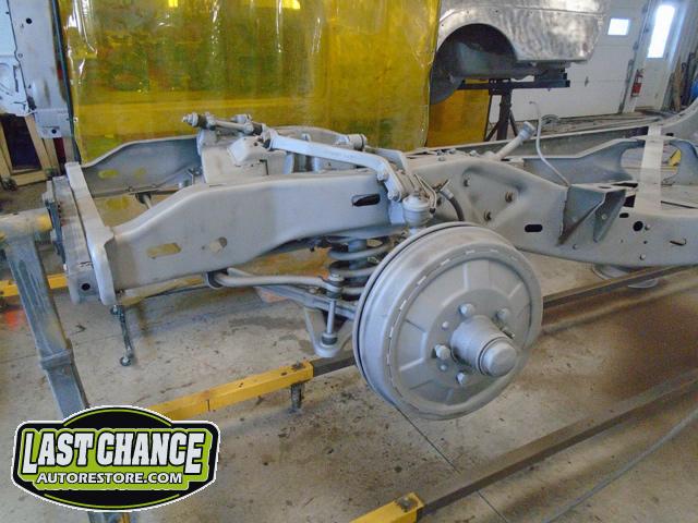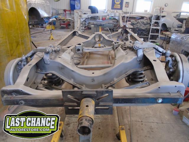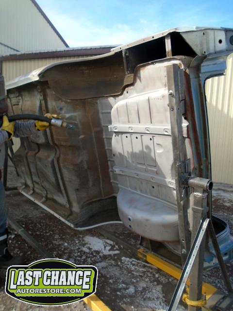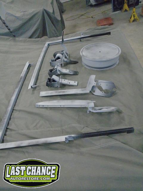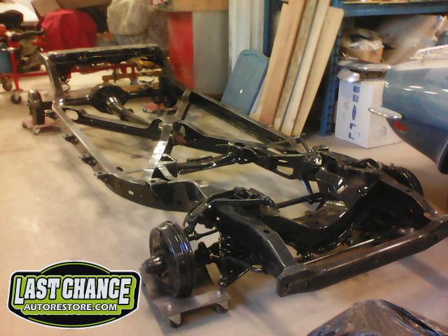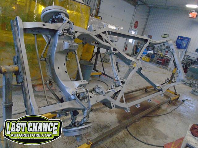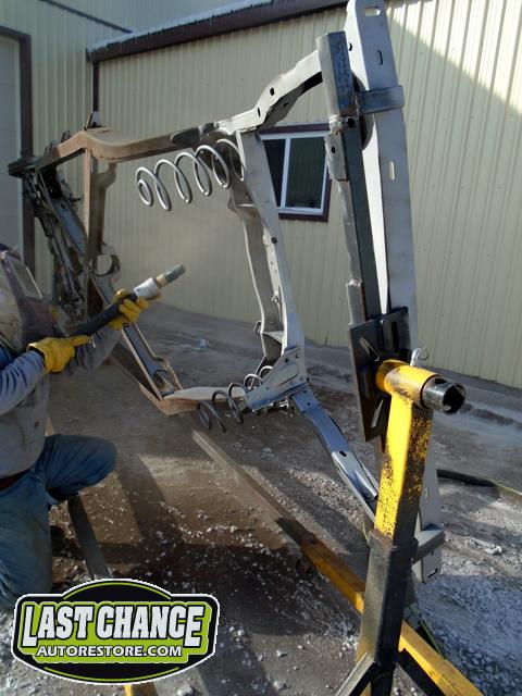 The frame was installed on a rotisserie and the complete frame was media blasted, it turned out great!