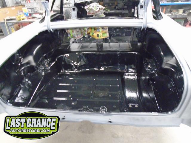 The complete interior of the car (including the roof and trunk) received two coats of two part black epoxy sealer.