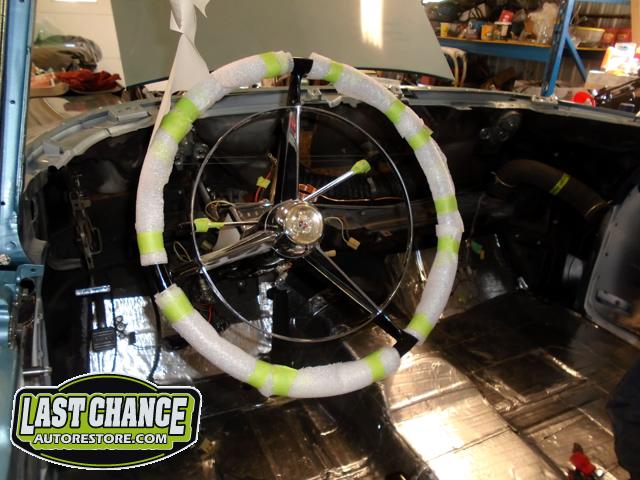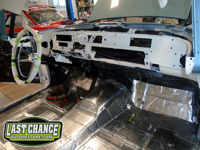 The rear bench seat and upgraded seat belts were also carefully installed. With the rear seat and rear quarter panels completed, our attention turned back to the front of the car. All of the dash components and wiring (along with a new brake light switch) was also installed.