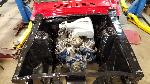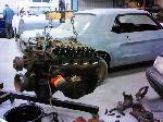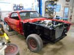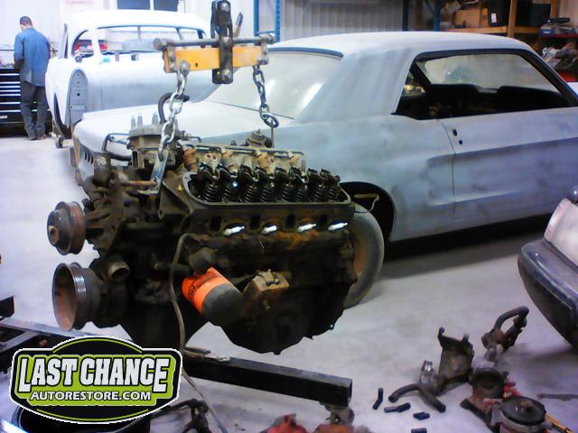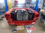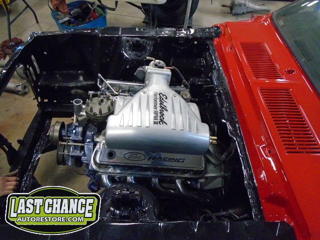 Our "new" motor and transmission was dry fitted into the Mustang engine bay and everything bolted up as we wanted. We pulled the motor and transmission back out and continued on with the body work.