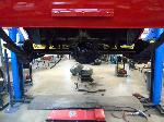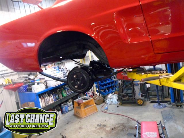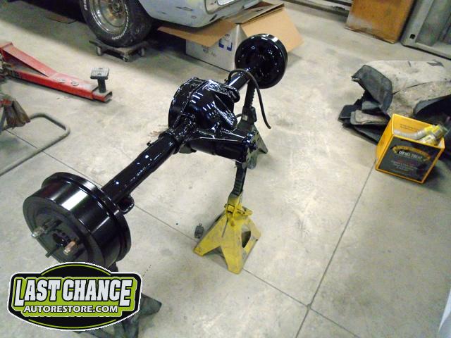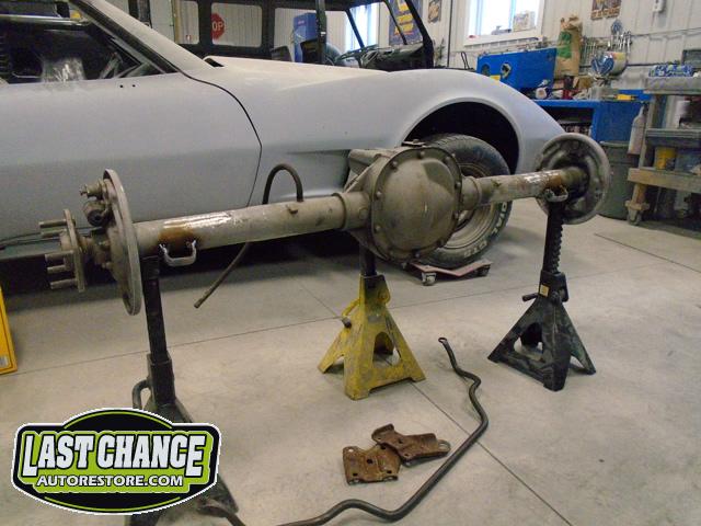 The old drum brakes were removed, the new complete Power Front Disc Brake Conversion Kit was installed, the original old rear end assembly was removed, the replacement rear end assembly was set into place.