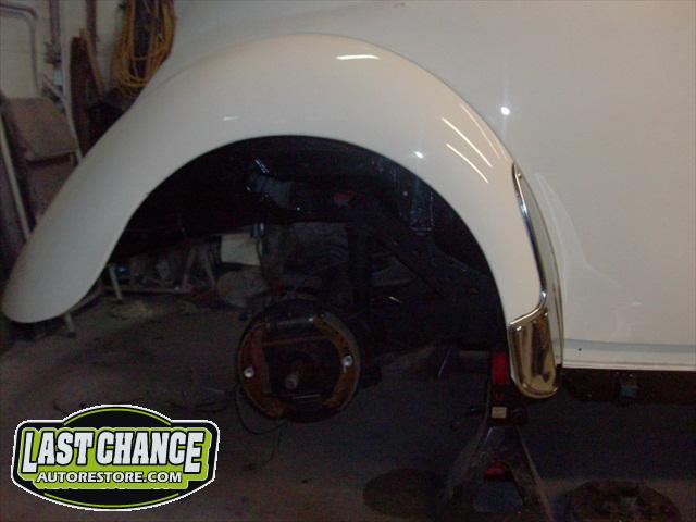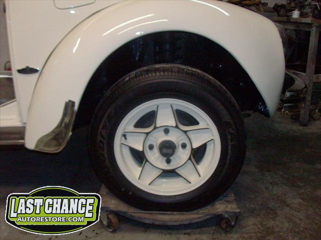 After the bodywork was completed, we painted Martha "Wimbledon White", and she looks great! We ordered new beige door panels, beige "basket weave" seat material, and a custom cloth beige convertible top along with a new high quality black carpet. We replaced all the brakes, brake lines and replaced the brake master cylinder. We sandblasted and painted a set of custom "A.T.S" "Period Correct" Alloy wheels, and installed brand new Goodyear Eagle "LS2" Tires.