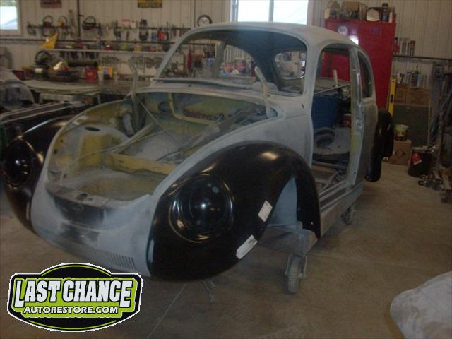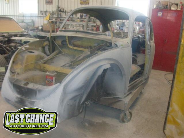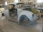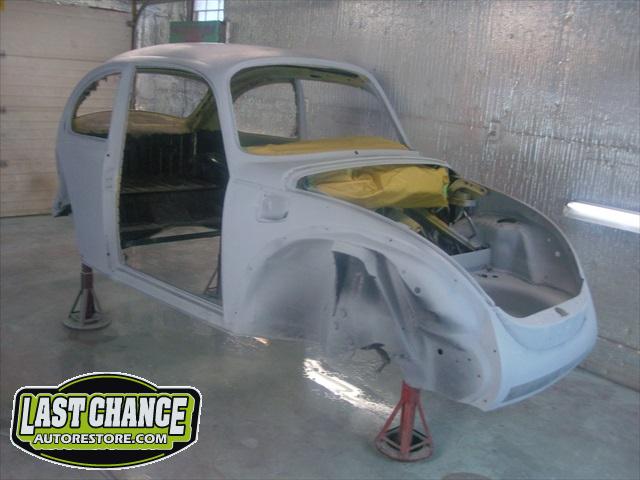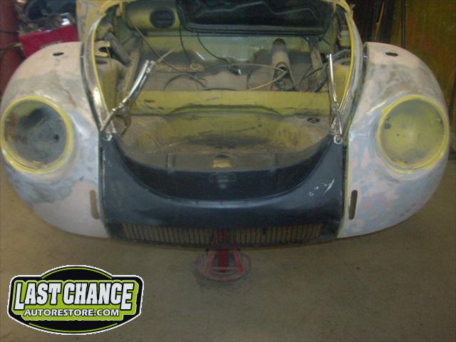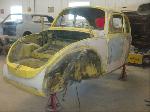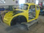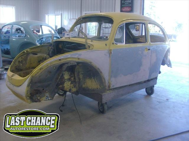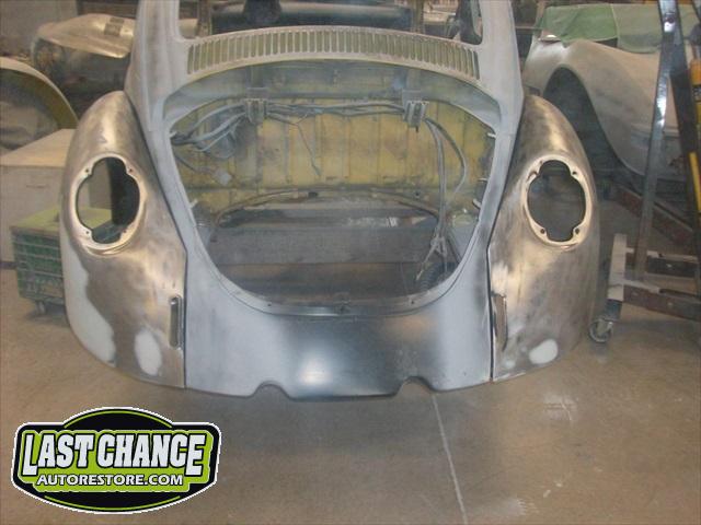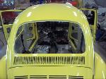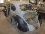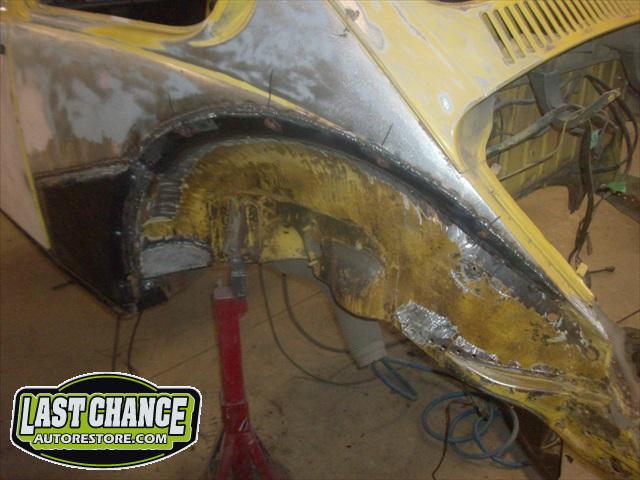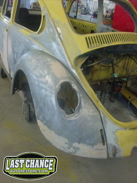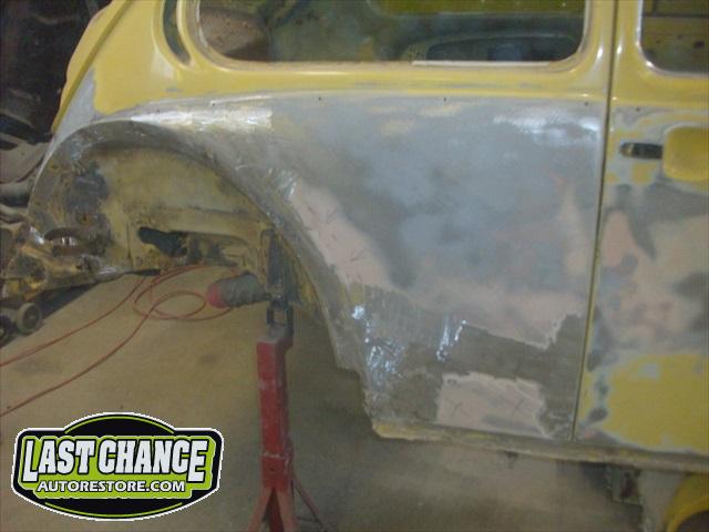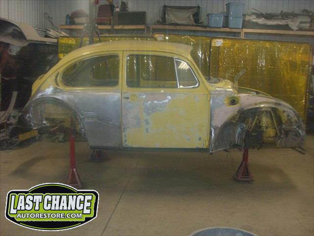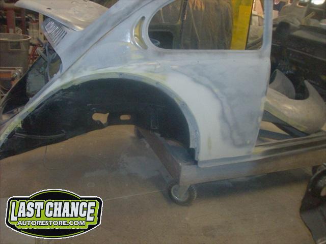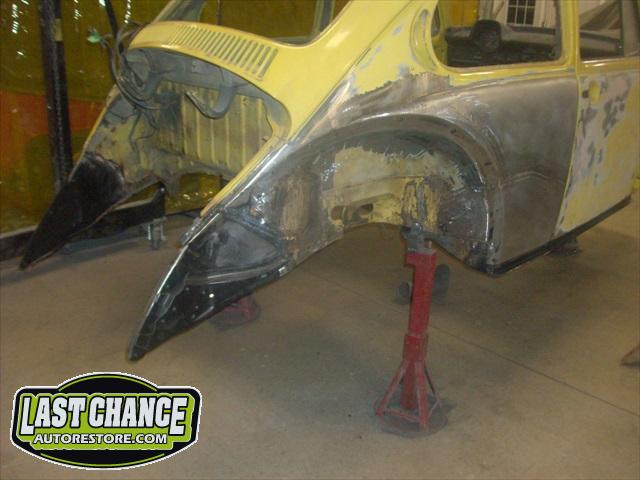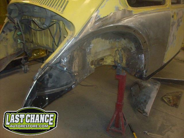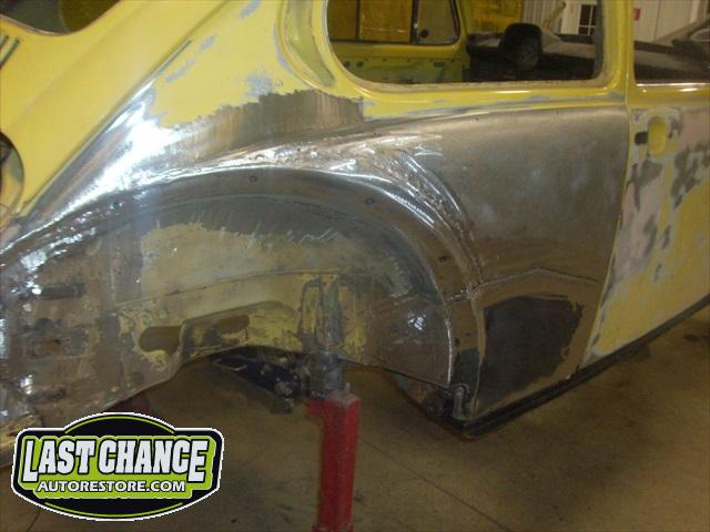 Sunny's body received cross bracing before the rusted out heater channels were removed (the heater channels are the main structural sections of a Beetle body). There was an extensive amount of cutting, grinding and measuring and prepping of rusted out sections before new panels were welded into place. We "dry fitted" all panels to be certain of proper fit before they were welded into place. (All 4 fenders were also dry fitted to be certain all new sections fit together correctly).