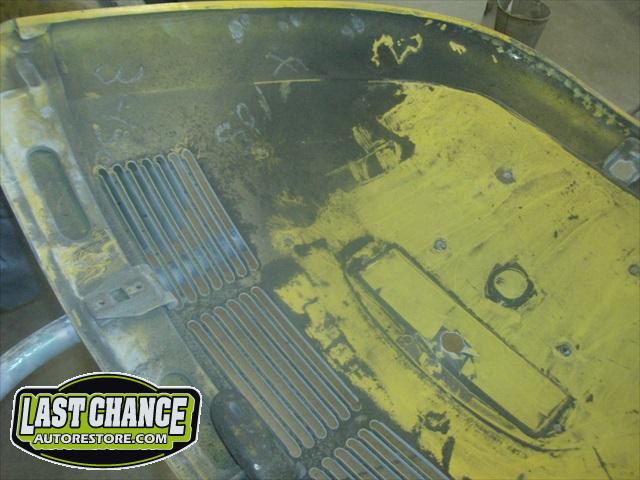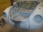 The front hood and rear engine lid required repairs (numerous dents were hammered and dollied out after old body filler from previous repairs was removed. Both panels were then degreased, sanding and received the same grits of sanding with special high build primer applied between coats.