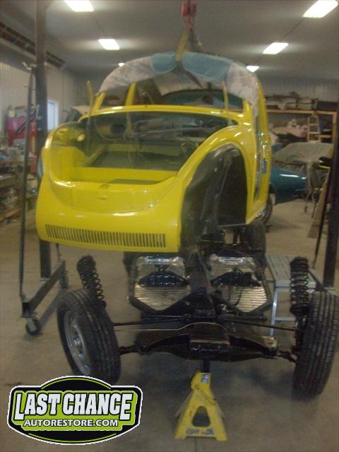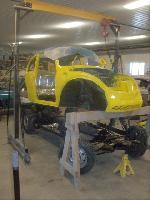 We started by preparing the body to be lifted off the chassis. It is a bit more difficult to lift the body off of a Super Beetle (because of the strut front suspension) than a "Standard Beetle".