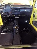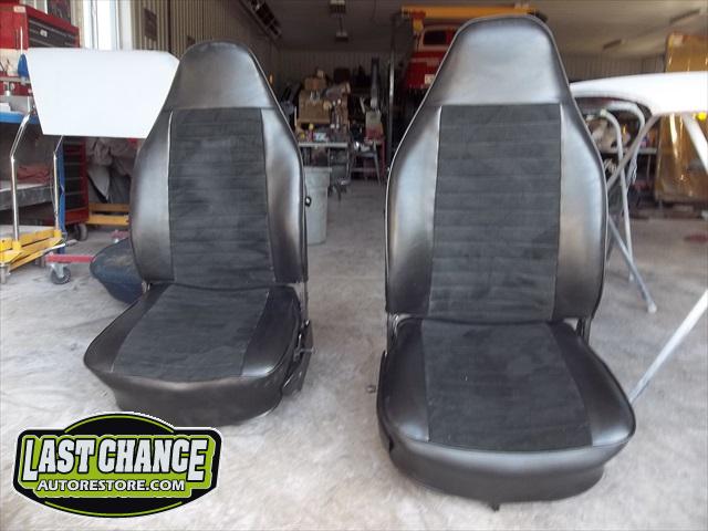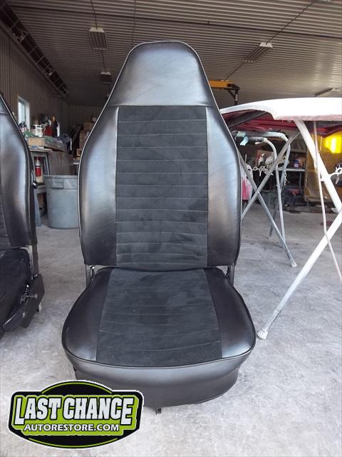 Custom made seat upholstery (with suede inserts to both front and rear seats) with all new foam for better support. New three point "Euro style" seat belts for the front and new Euro style two point belts for the rear were installed over the all new thick pile black carpet kit. New door panels were installed to complete the all new looking interior.