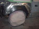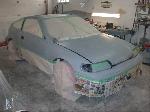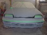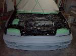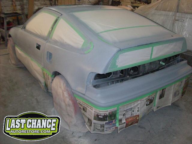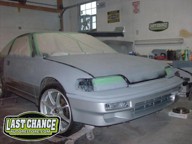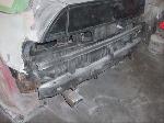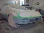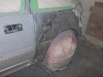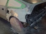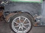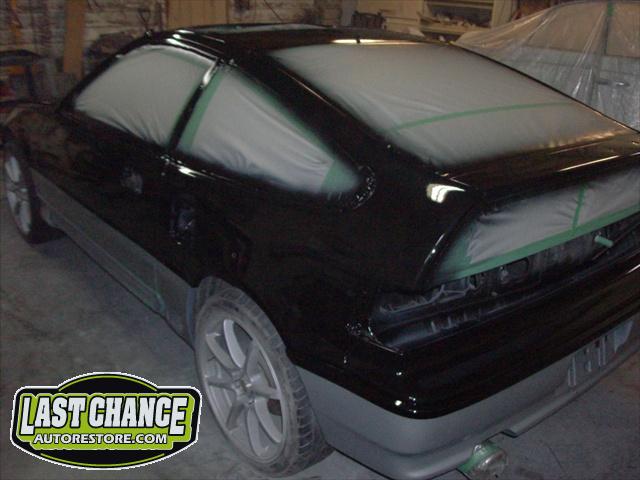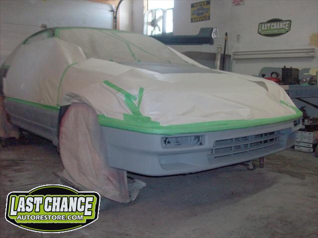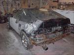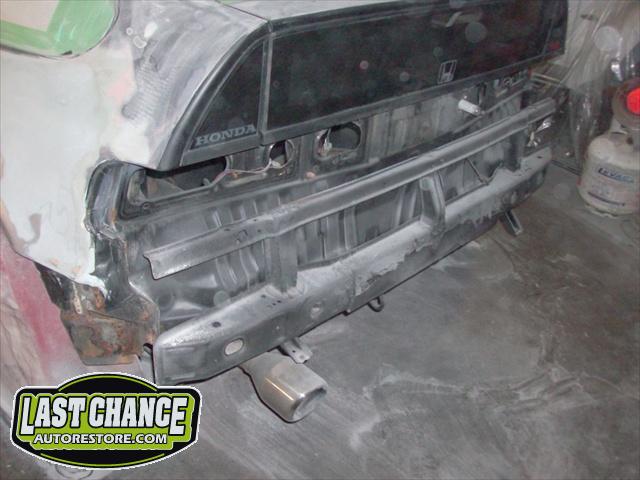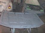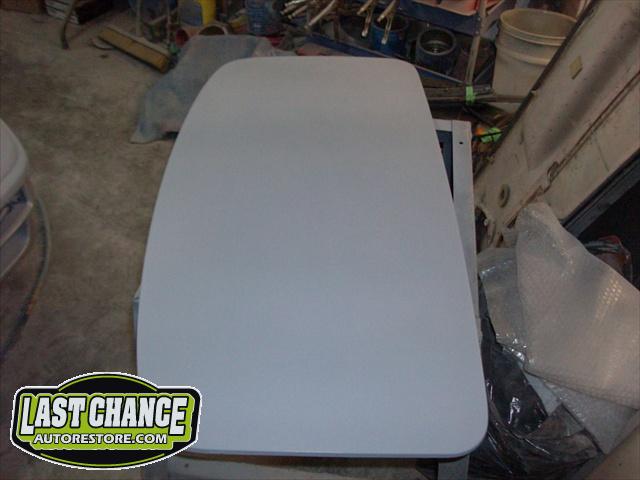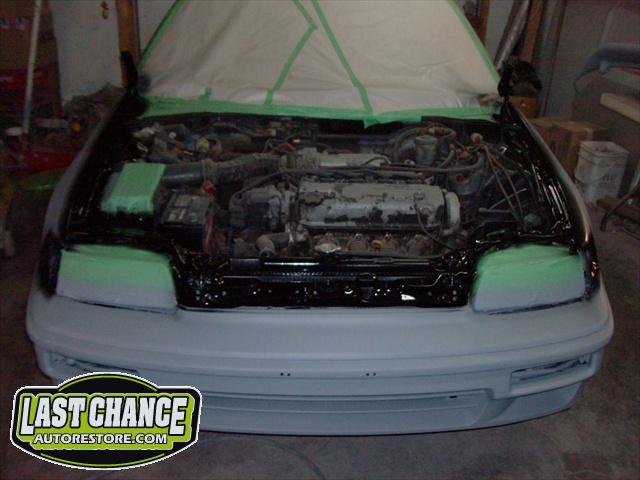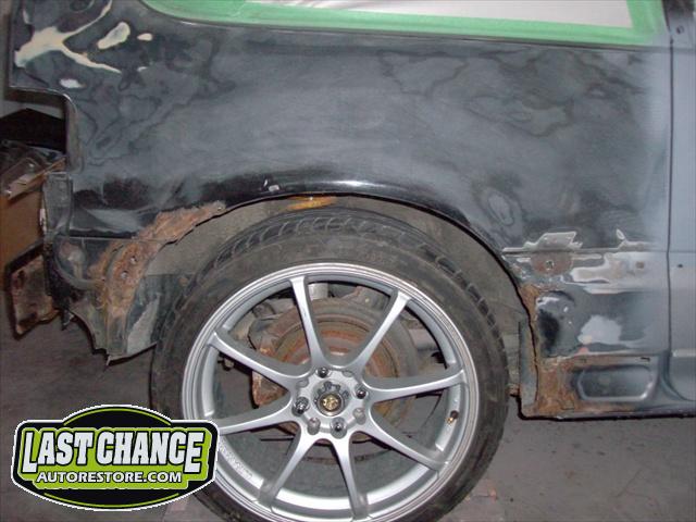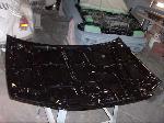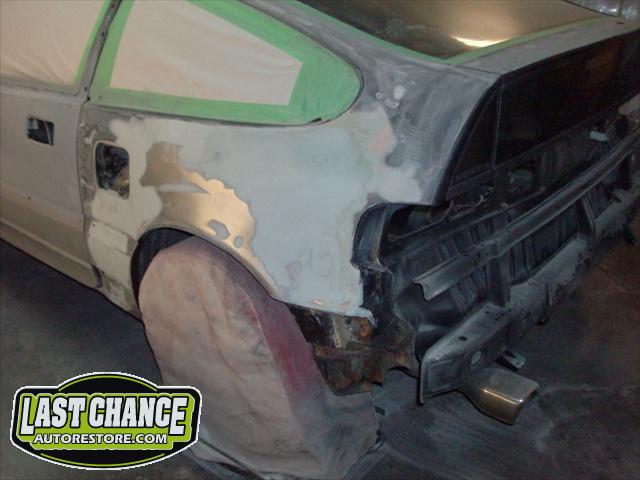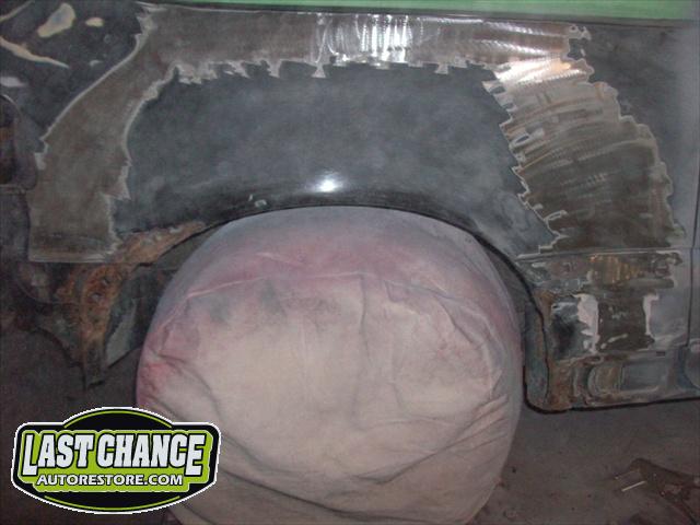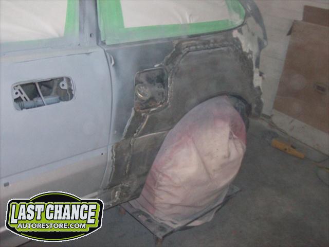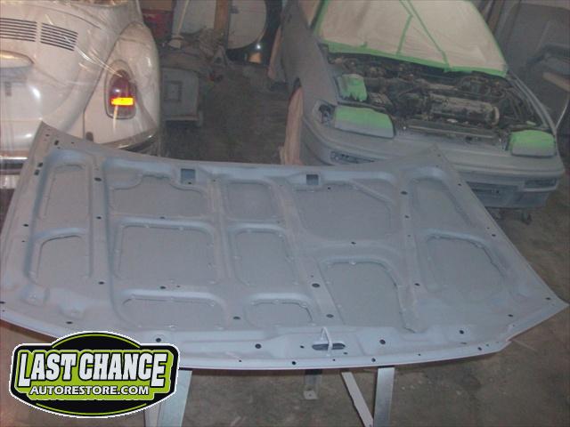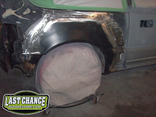 We performed a complete body job, replacing both rear quarter panels and repaired both rocker panels with new metal. We replaced the badly dented hood with an aftermarket one.