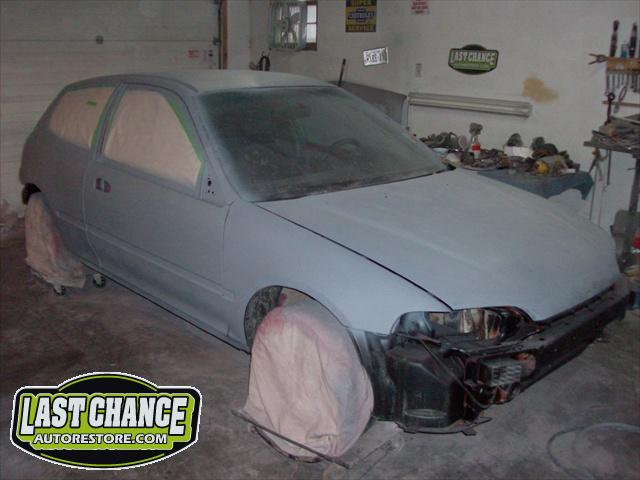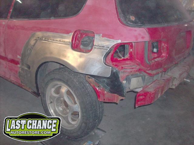 This is a 1994 Honda Civic hatchback that has received a full body job. We replaced the typical rusted out areas above both rear wheel wells with new aftermarket rear wheel arch panels. We have also repaired the lower rocker panels on both sides with new metal.