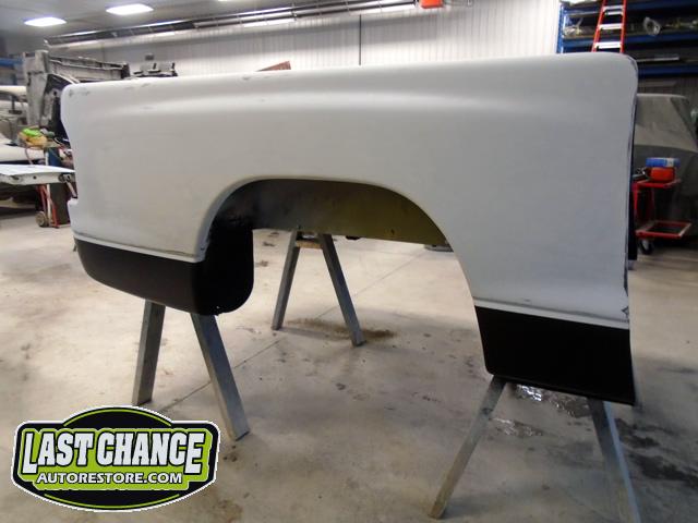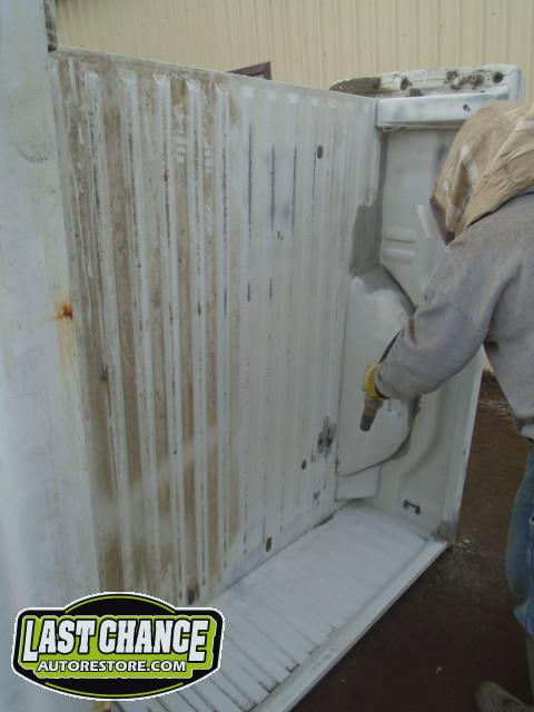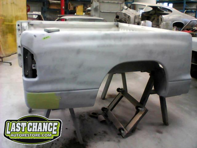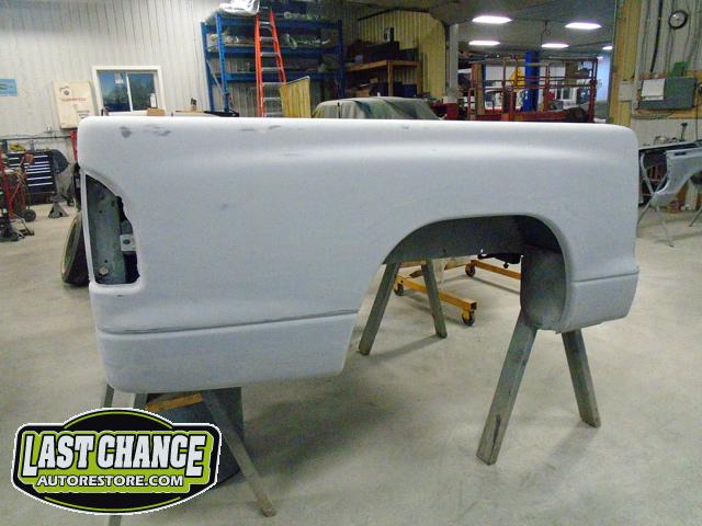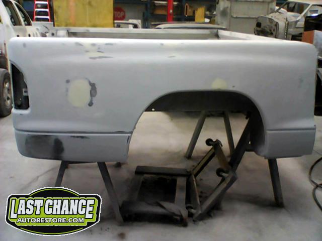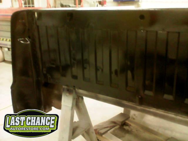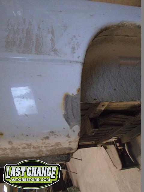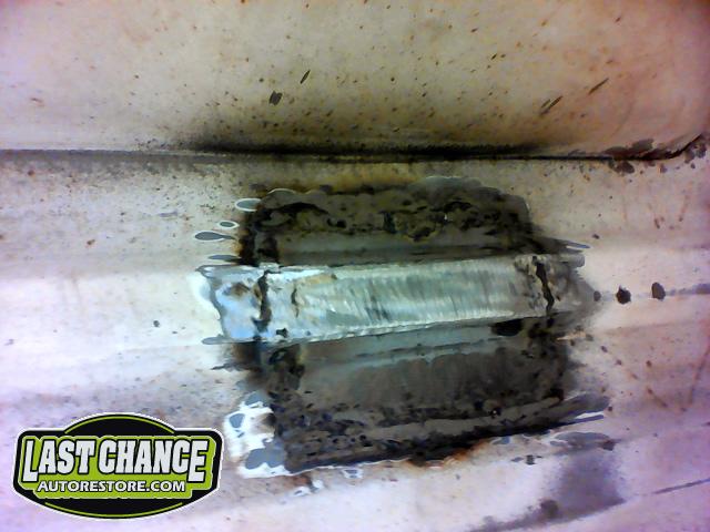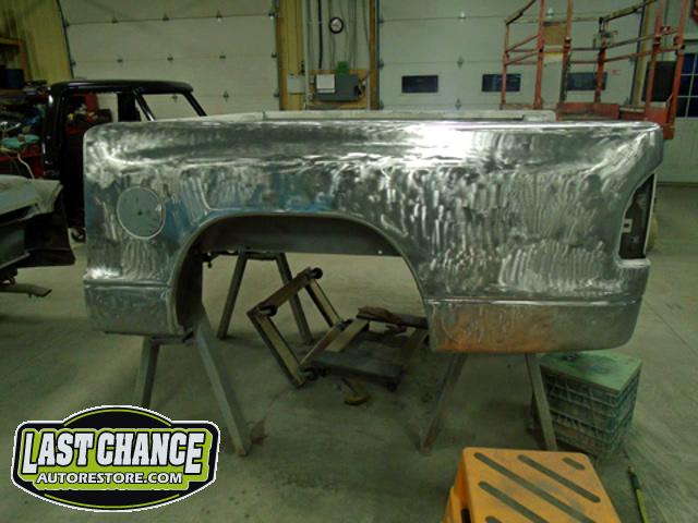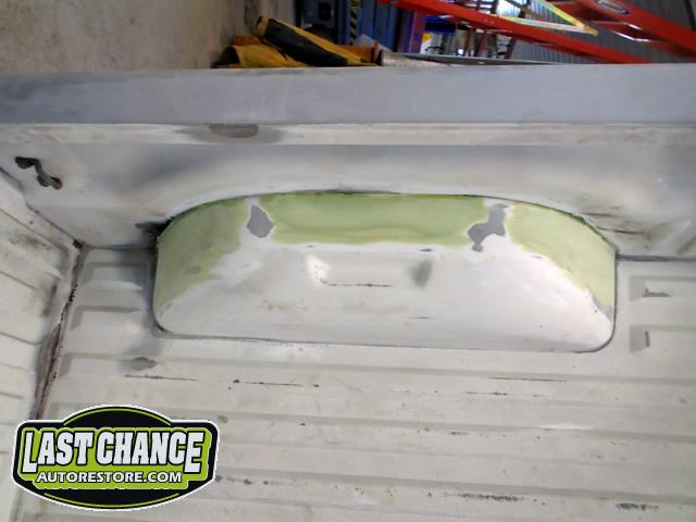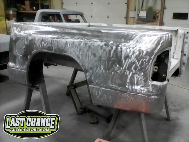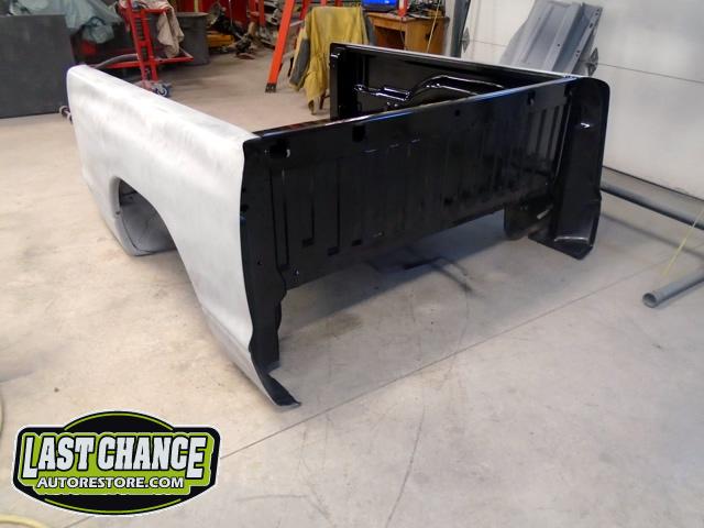 The rusty box was removed from the frame, sandblasted and several new metal patches were made, welded and installed.