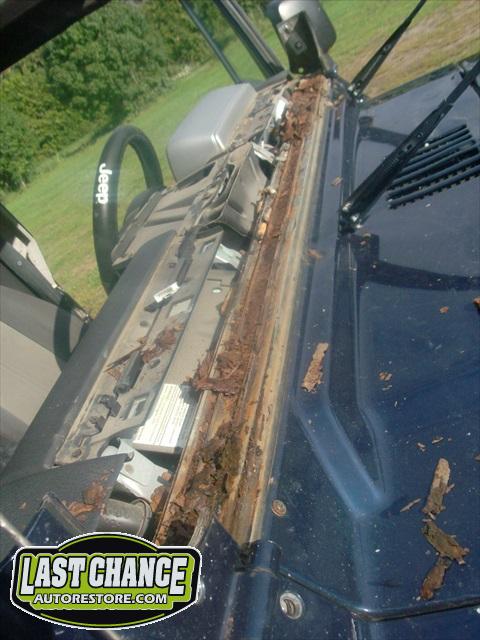 The windshield frame was completely rotted along the bottom and was allowing wind and rain to come in to the cabin. The windshield was also cracked and needed replacement.