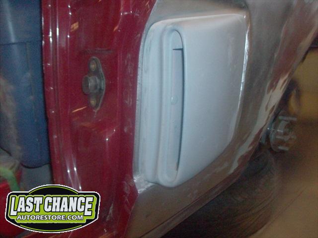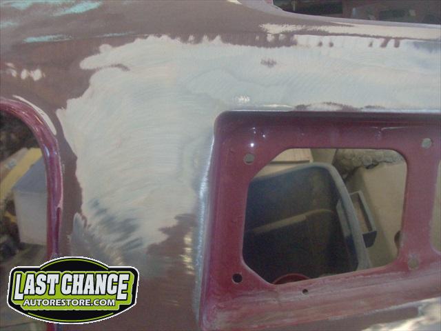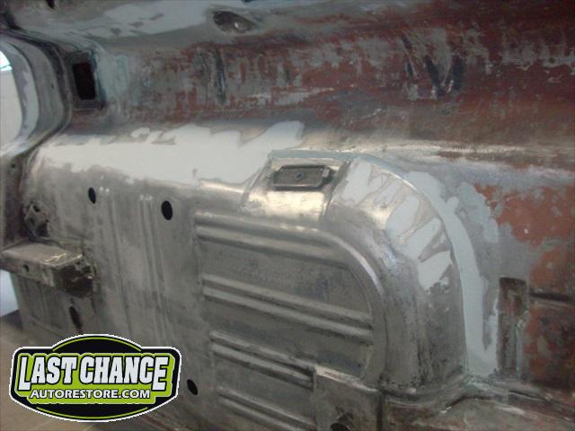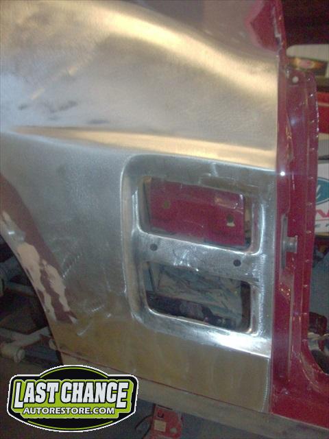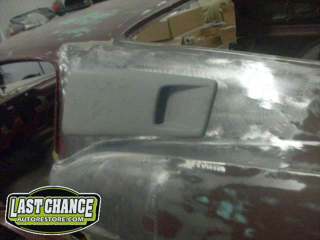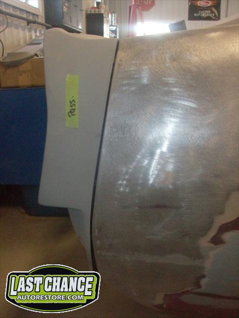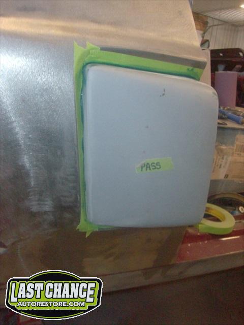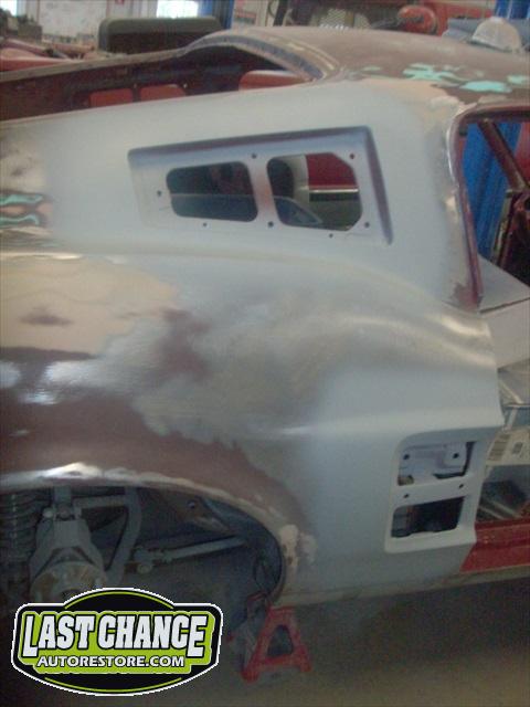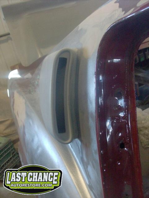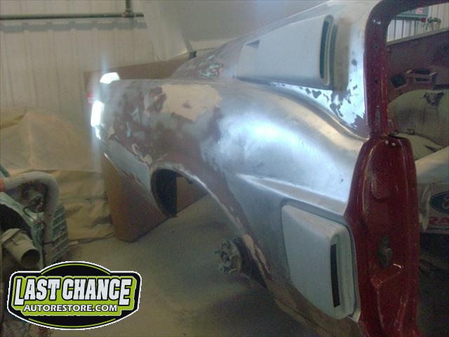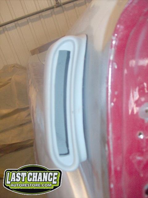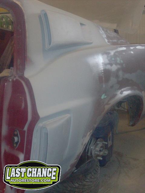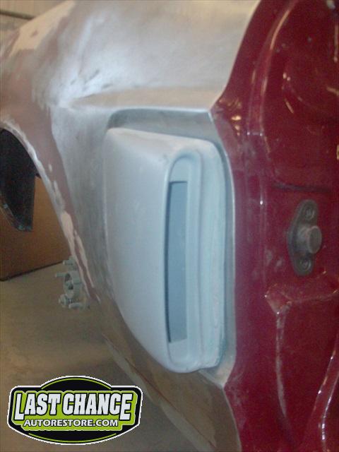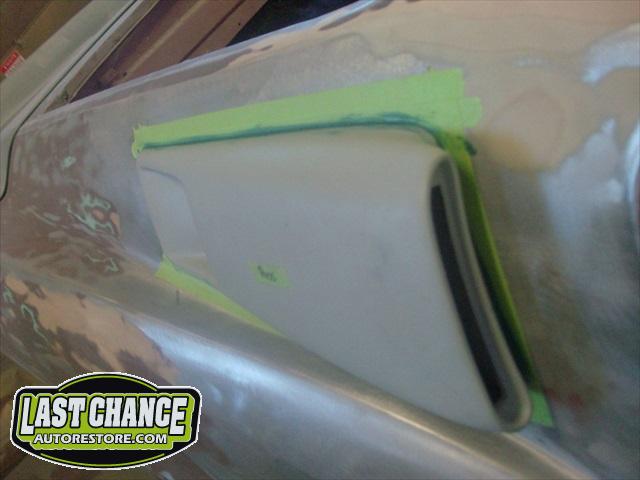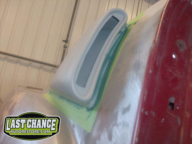 The body upgrades have begun. The 4 Shelby side scoops (two per side) were dry fitted, body smoother was added where needed (to ensure a proper snug fit to the body panels). Once the scoops fit perfectly to the panels, the surrounding area of the quarter panel was sanded to bare metal and a special etch primer was applied to properly seal the bare metal and prepare it for upcoming primer.
