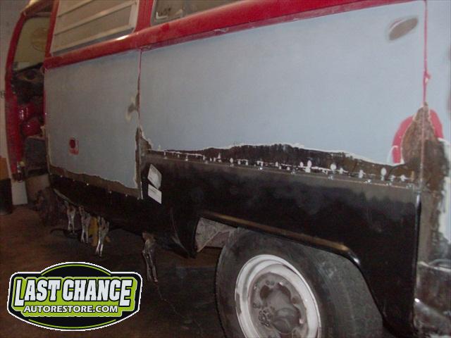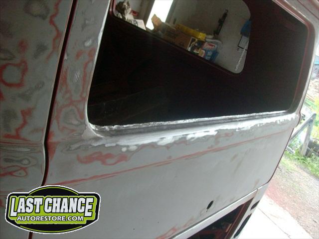 We began cutting away old rusted out metal and removing large amounts of body filler. Whoever performed the previous repairs did not repair rusted out areas correctly...they welded replacement panels on top of the rotted ones. It appears the side panels warped due to being overheated. They used a hammer and dented in the panels above the new panels & used excessive amounts of body filler in an attempt to level out the sides of the van.