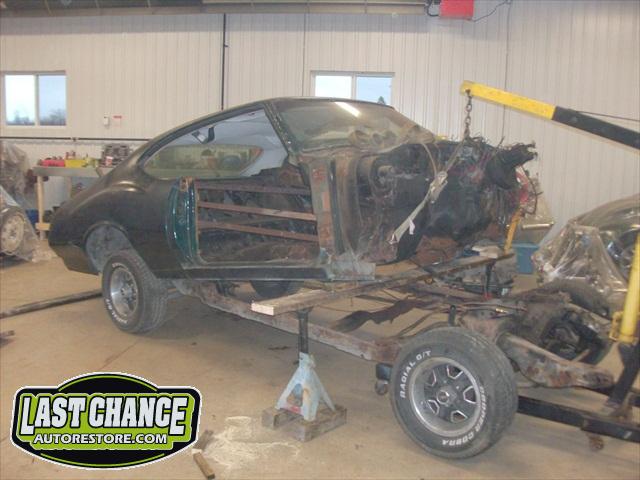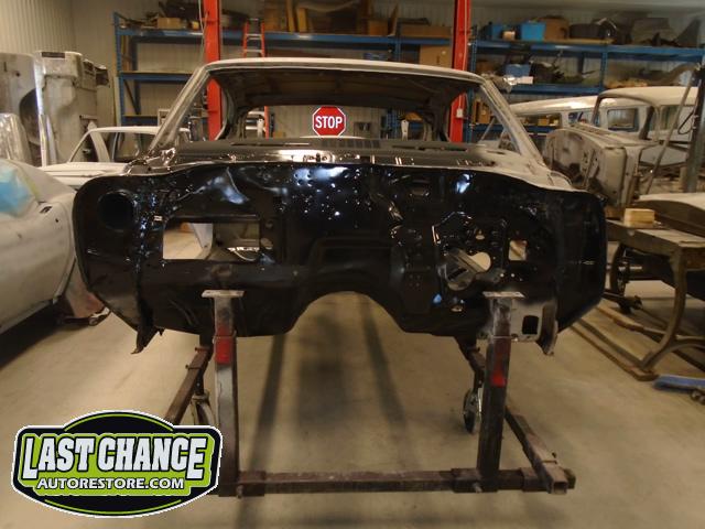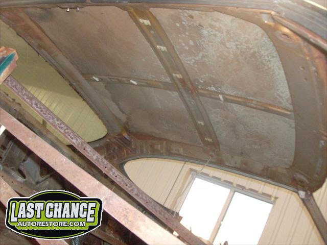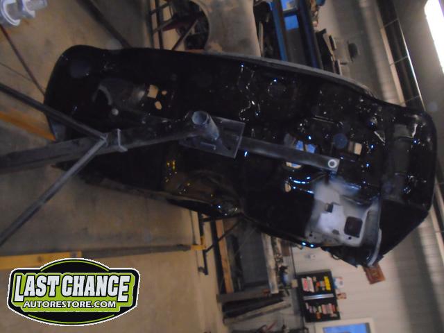 Our attention turned to the car body next. We removed the hood, fenders, bumpers, grille, radiator support, doors, all glass, the complete interior and dash was also removed. The driveline and exhaust was also removed. The body was removed from the original rotted out old frame and installed onto a rotisserie.
