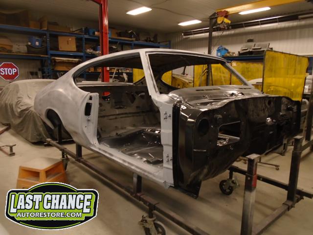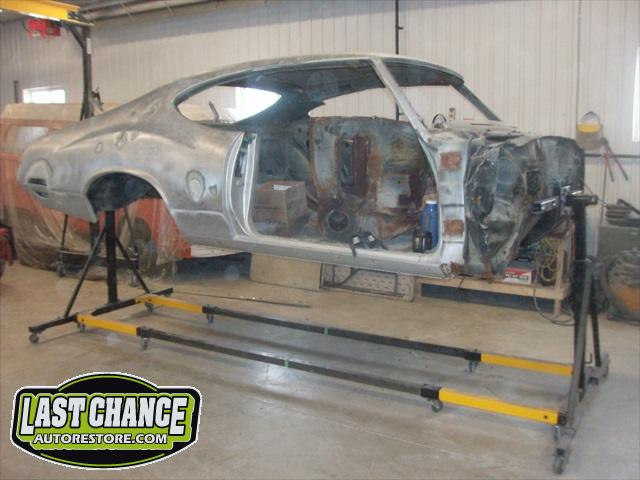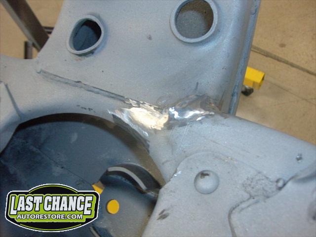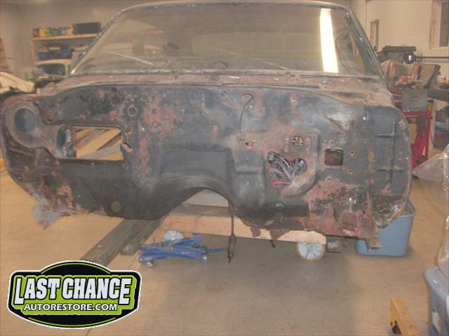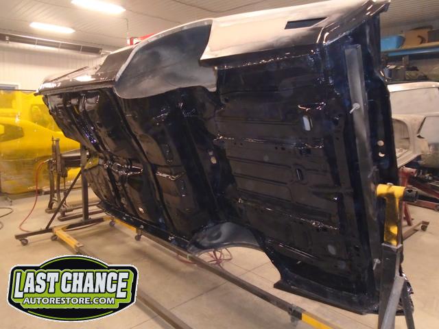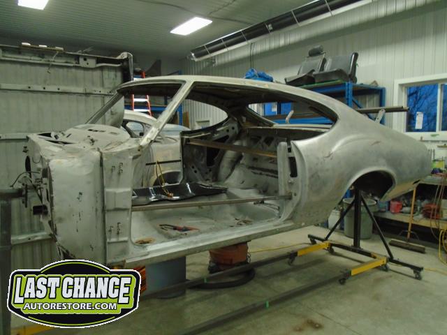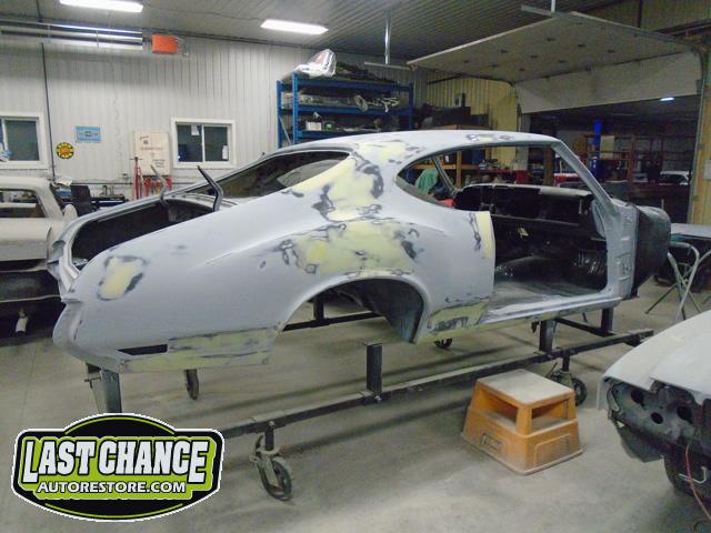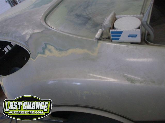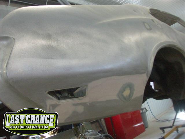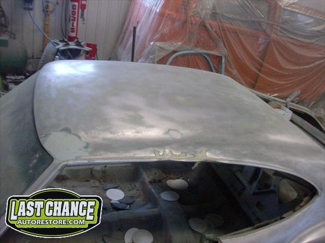 The replacement (Silver Body) was dis assembled. Several layers of paint and primer was sanded down to expose a very nice body shell. The replacement body was installed onto a custom built rotisserie.