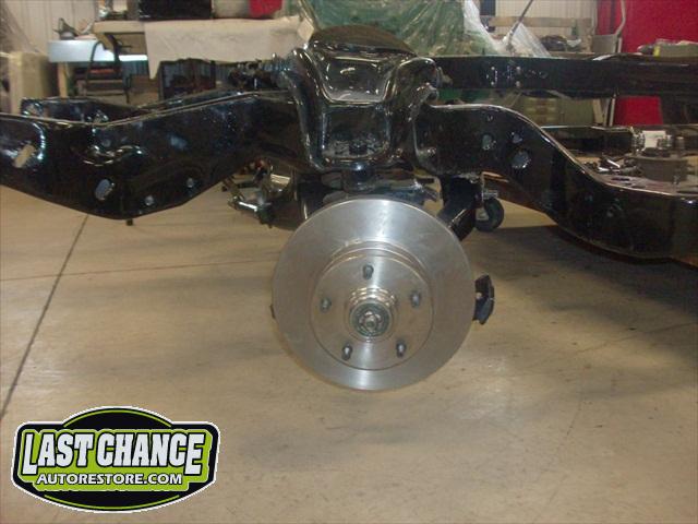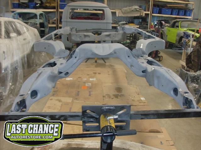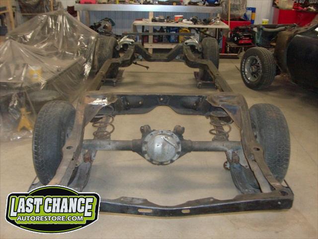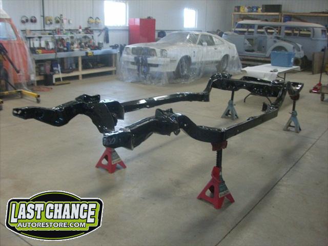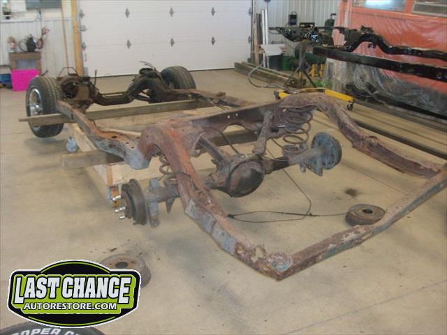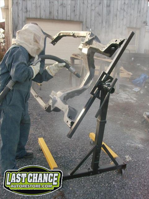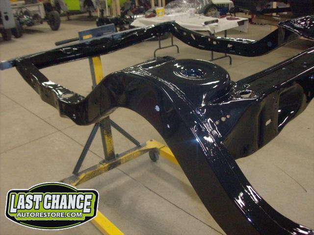 We removed the old brakes lines, fuel lines and steering box assembly, degreased and sandblasted the entire frame.