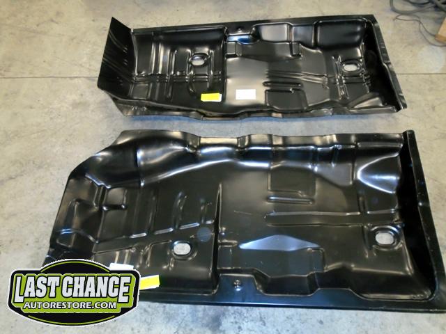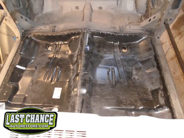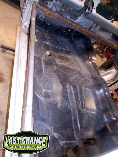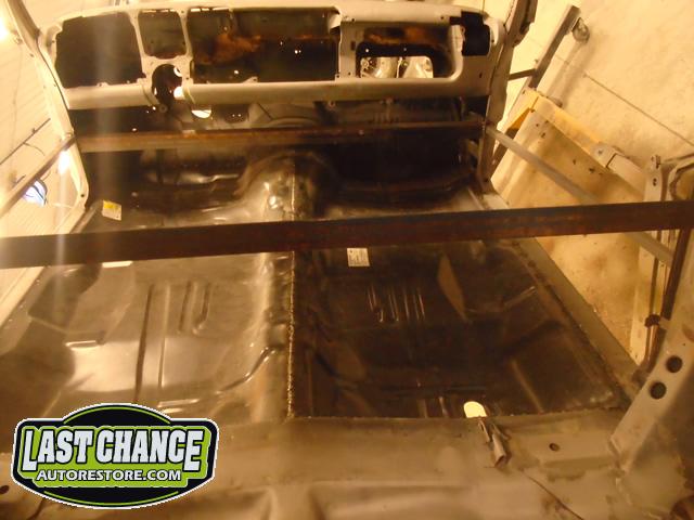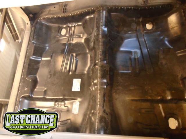 Factory correct (high quality) replacement floor pans, trunk pan and main support rails were ordered. The rusty old metal was cut away, new panels were dry fitted and welded into place.