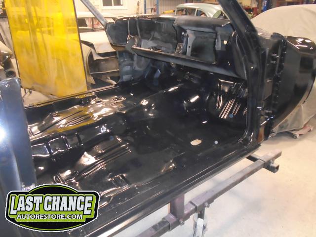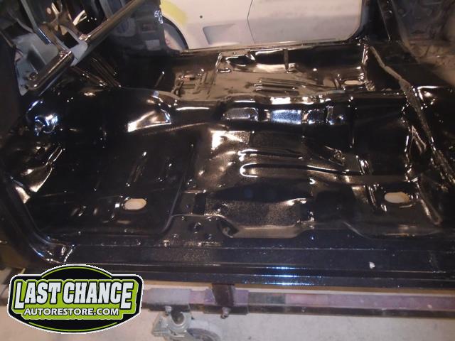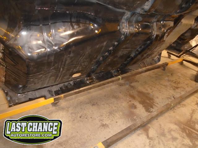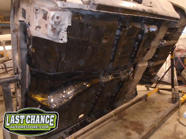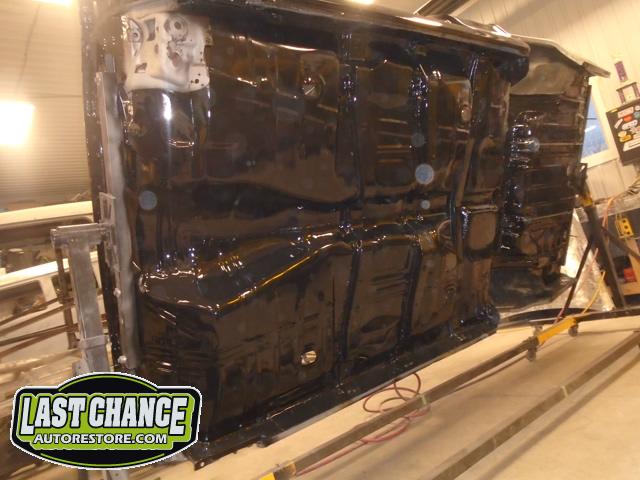 Once all of the welds were ground smooth the complete underside of the car received two coats of a special black two part epoxy paint.