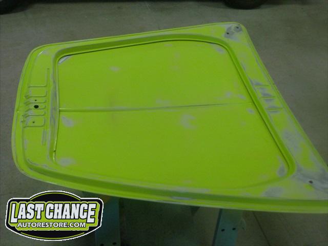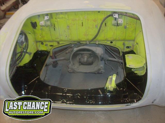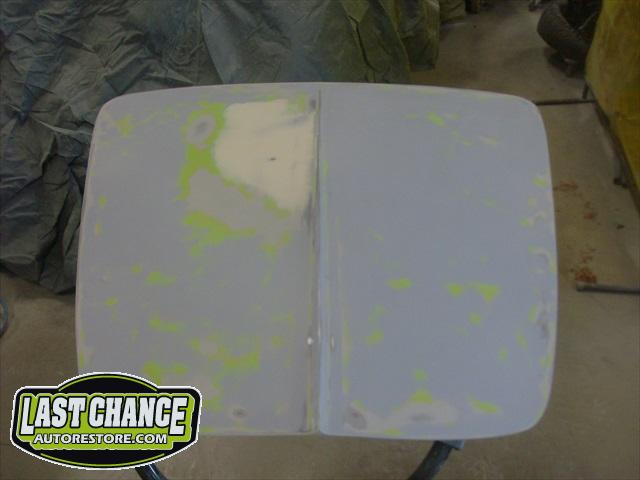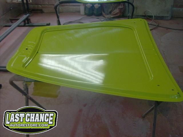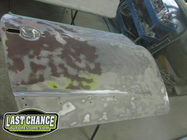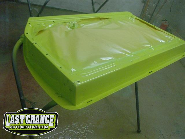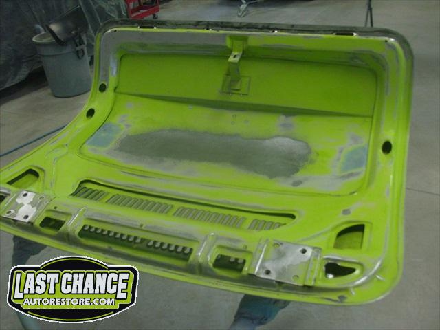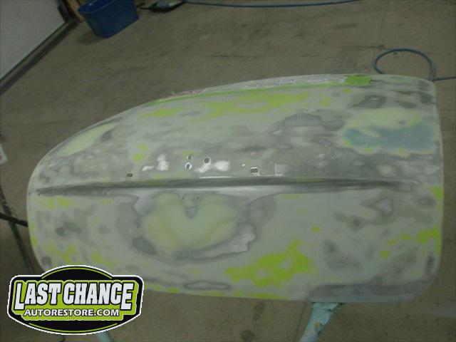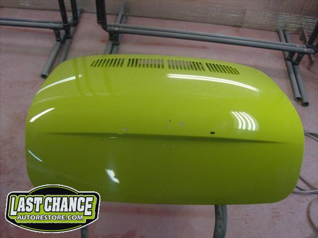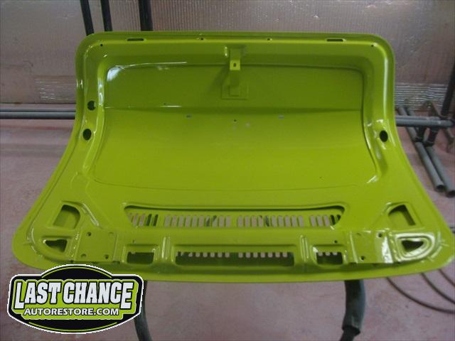 The front hood, engine lid and doors were worked on next. After many hours of repairs and body smoothing, they were all painted.