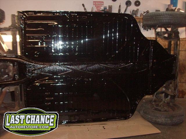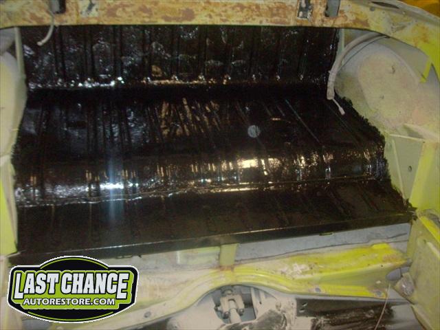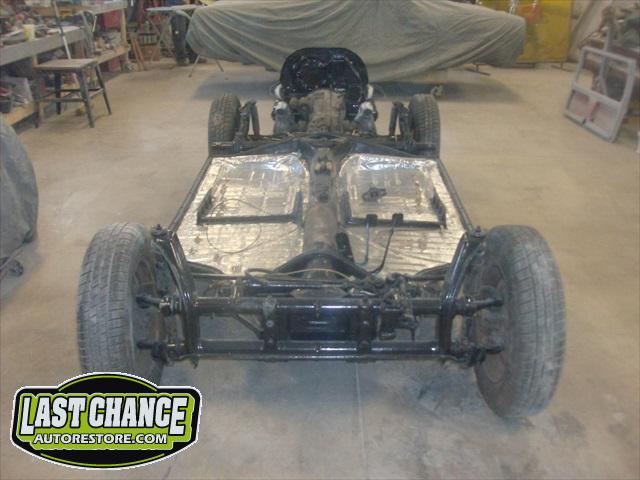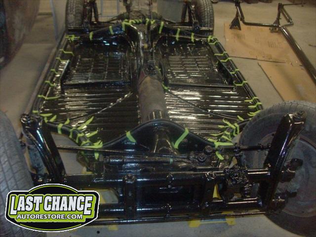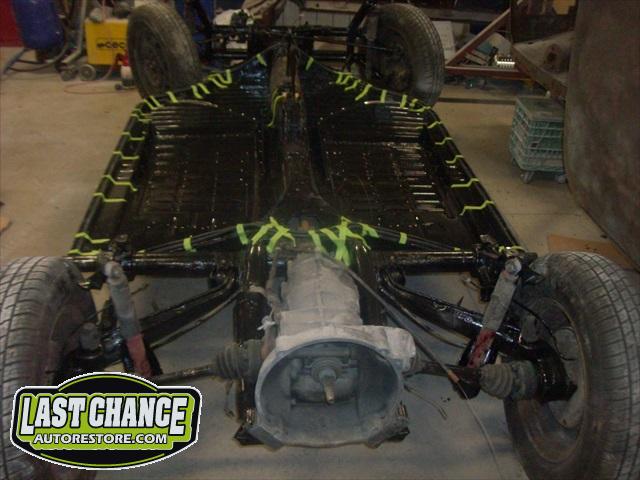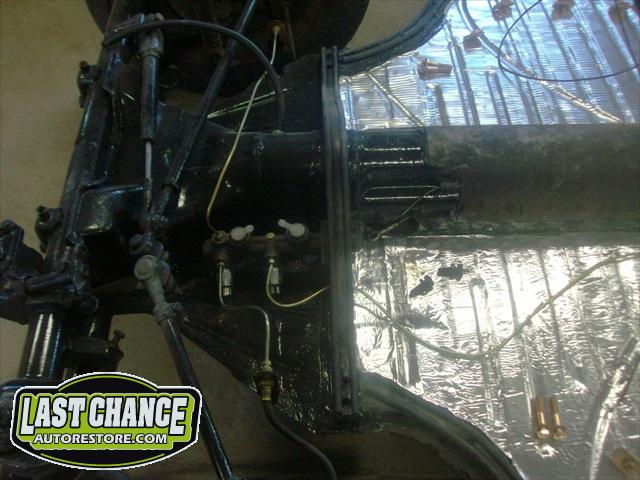 The chassis received the final coat of special POR15 black gloss paint. We installed new "chassis to body" rubber seals. The new brake master cylinder was installed with all new metal brake lines along with new brake pressure switches. We installed sound insulation to the complete floor pan area too!
