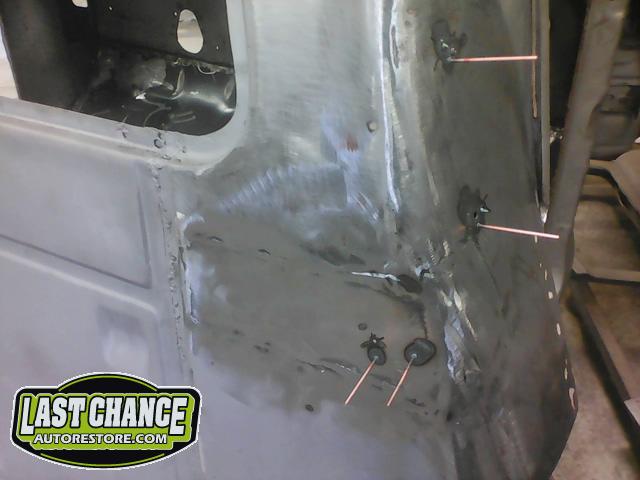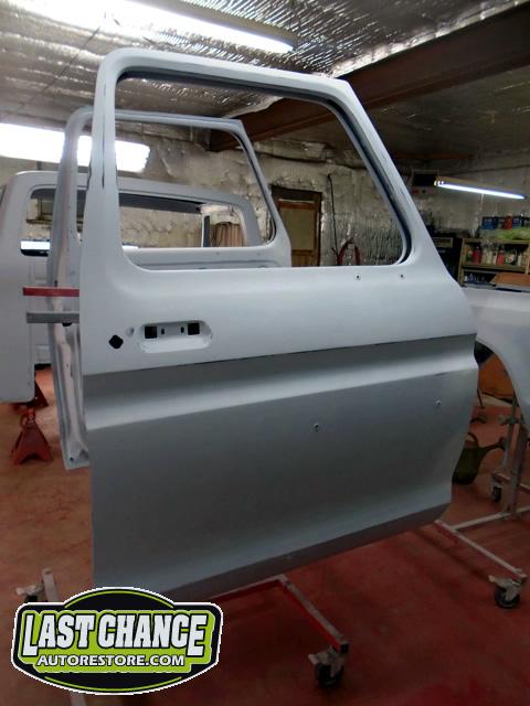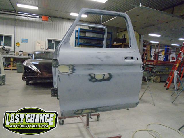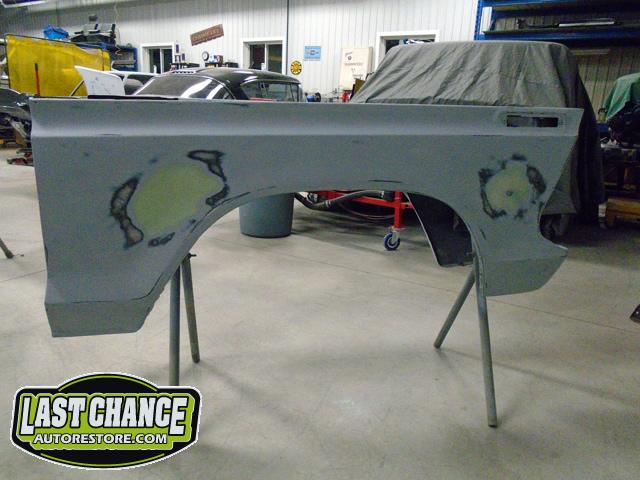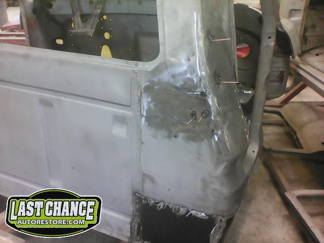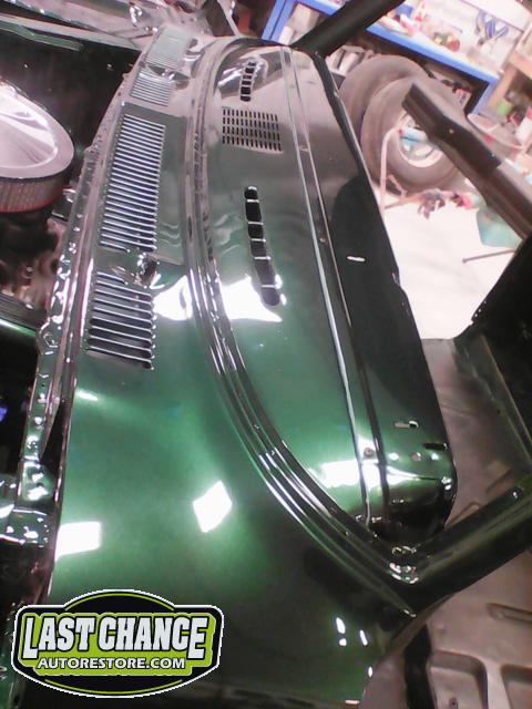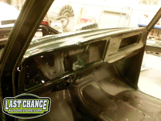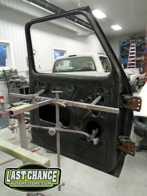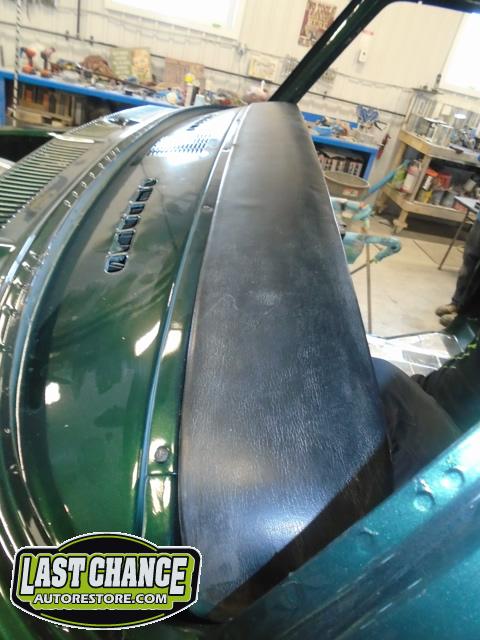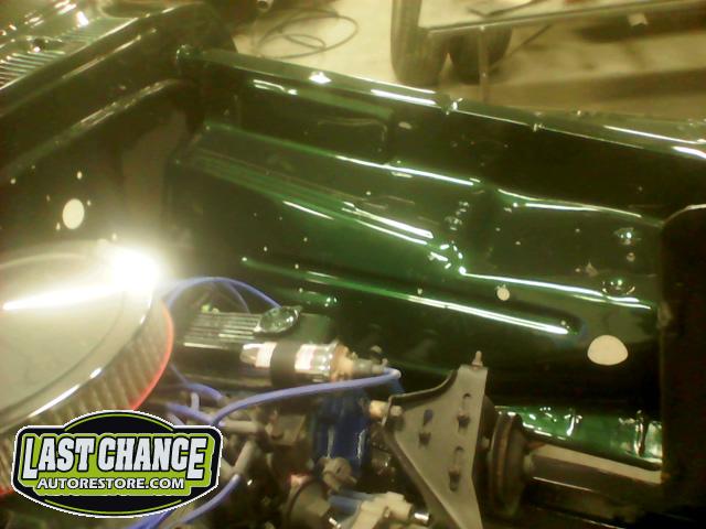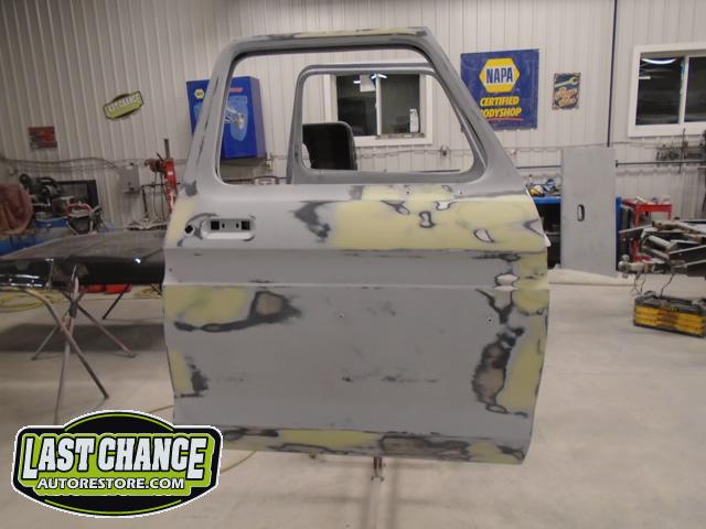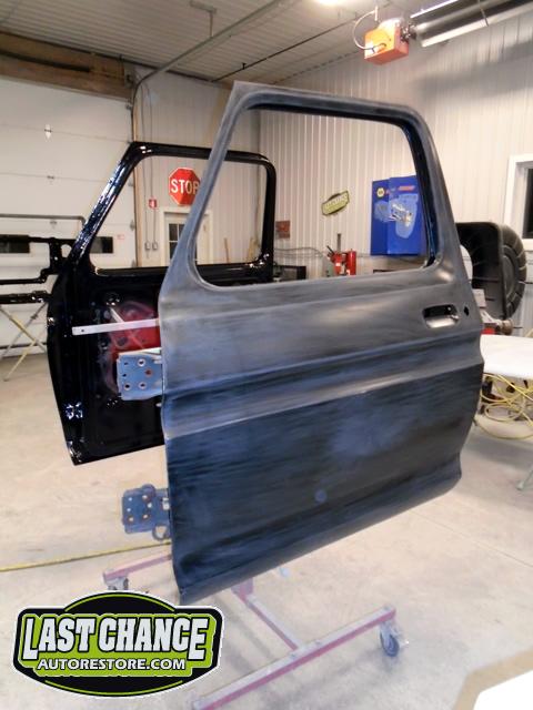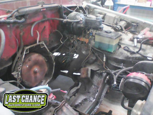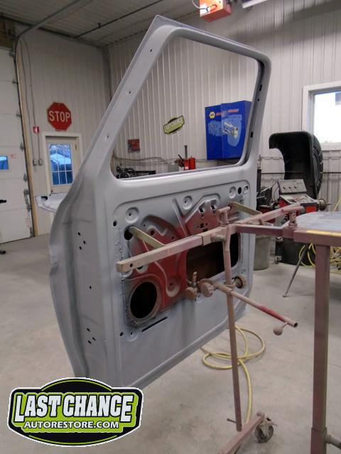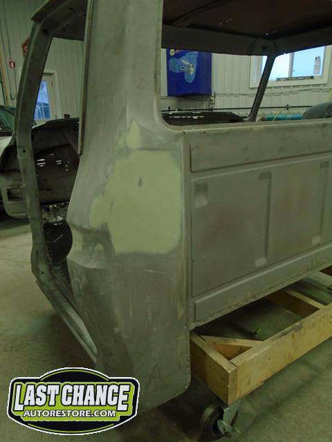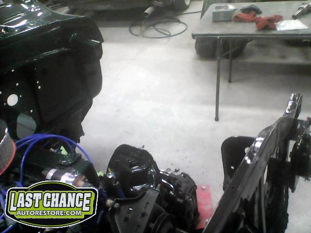 The re assembly continued. We installed the front windshield, rear sliding window, both doors, both front fenders and front hood hinges and hood were installed.