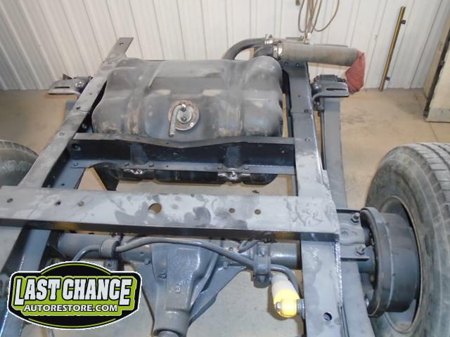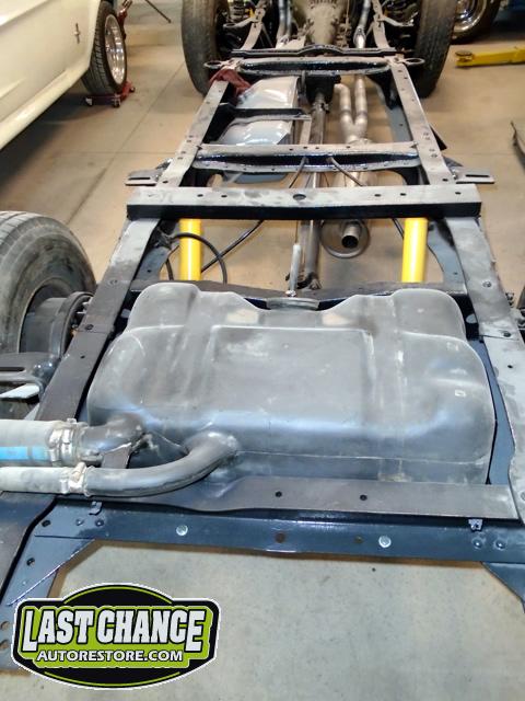 With the truck frame back on its temporary wheels and tires, we re installed the freshened motor and transmission along with a new exhaust system and installed the dual fuel tanks.
