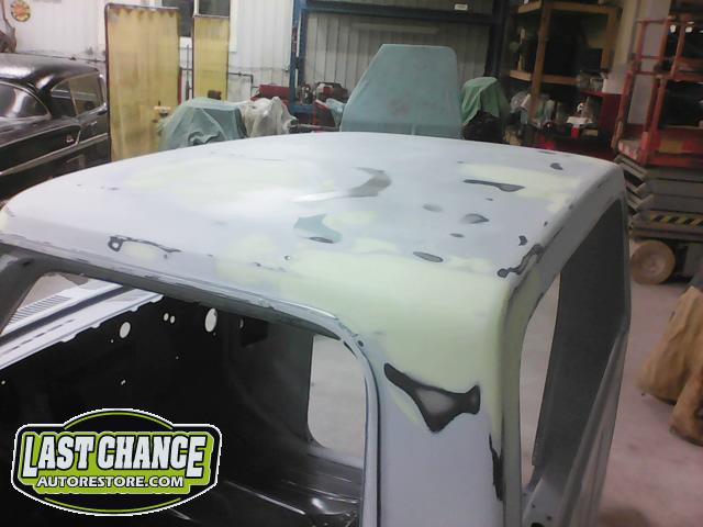 Once the fabrication was completed on the cab, it received two coats of a special black epoxy primer (to help seal the bare metal) before it received it first coating of grey high build primer. Body smoother was added where needed , and block sanded.