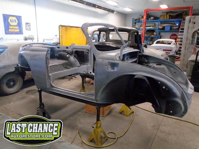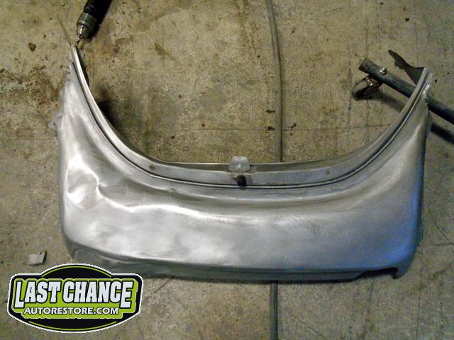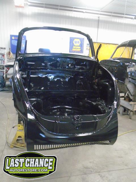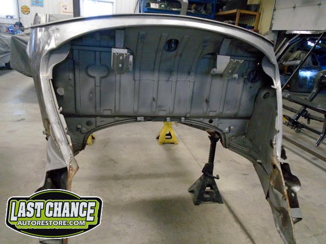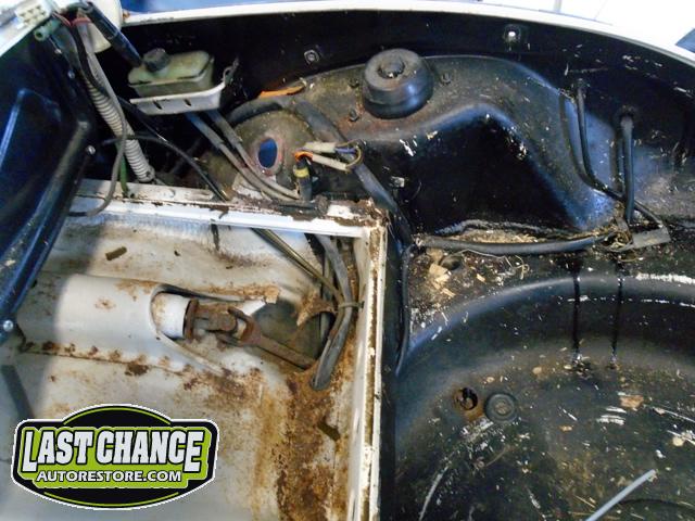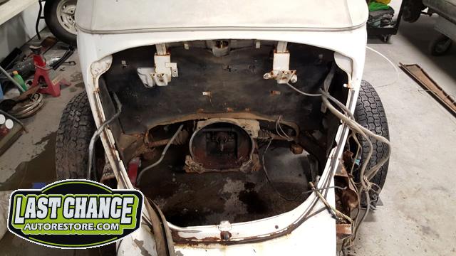 The front and rear bumper brackets along with front and rear fenders were removed first. The hood and engine lid next. All of the under front hood components were removed, the gas heater, spare tire, windshield washer lines and jug and gas tank.