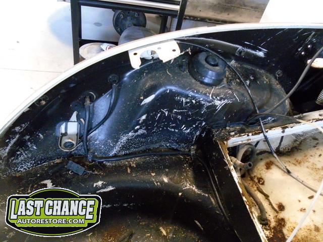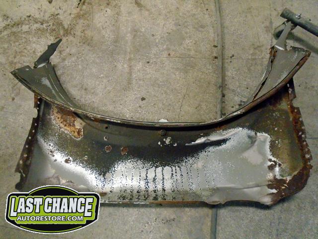 The rusted out rear apron panel (at the rear engine bay opening) was removed from the body after all of the factory spot welds were drilled out. (We will be welding in a new replacement rear apron panel later).