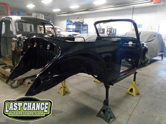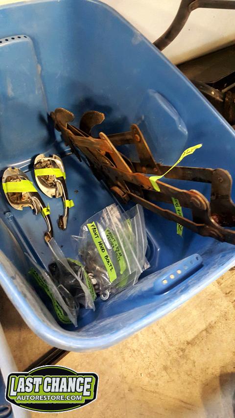 The complete convertible top was unhooked and removed from the body. The remainder of interior trim was carefully removed and labelled and put into bins.