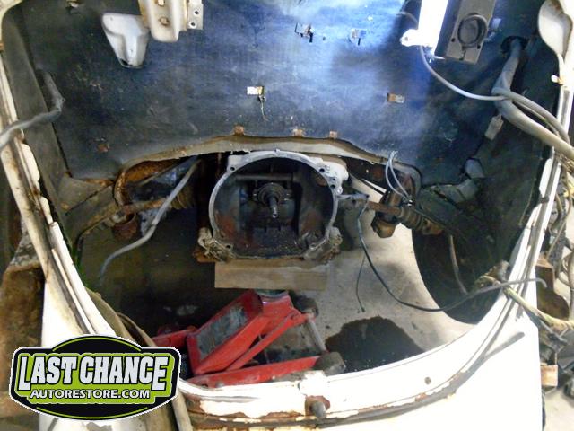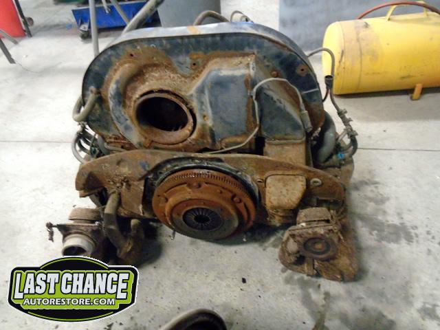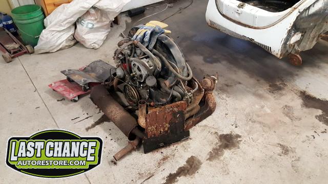 We removed the engine from the chassis after unbolting it from the transmission and dropped it out through the bottom and out of the way after unhooking the heater controls, fuel line and starter.