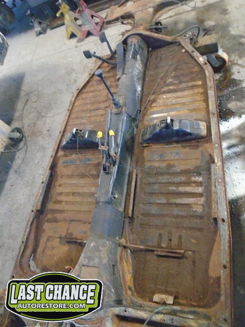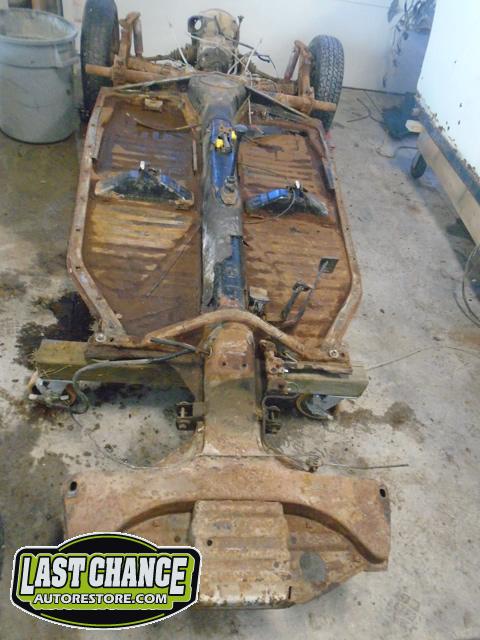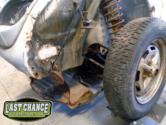 The body was lifted off of the chassis/pan assembly after the front struts and steering was unbolted and set on one of our beetle body dollies. The chassis section will need to have new floor pans for both the driver and passenger sides (very common on Beetles).