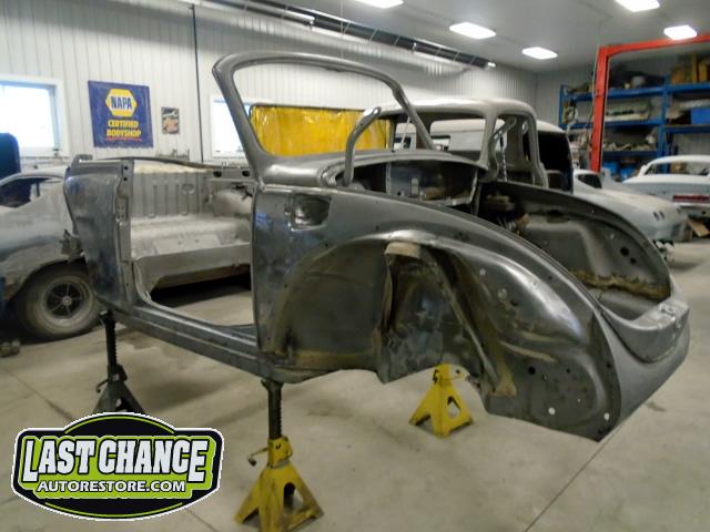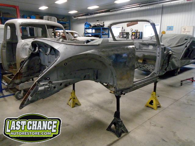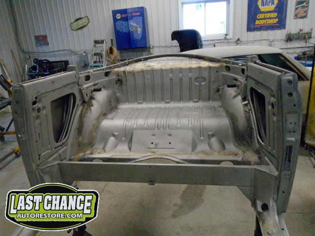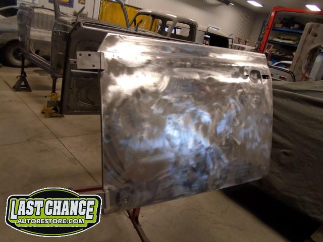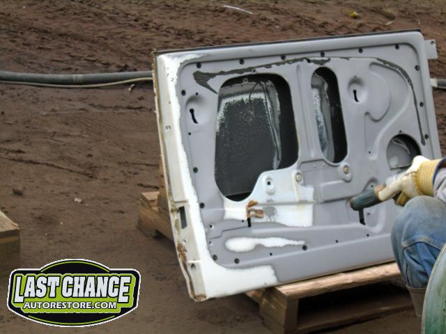 We unbolted both doors from the body and began to prepare the body for media blasting. With the body degreased and wiped down, the complete body was media blasted to bare metal. Both door frames were media blasted and the exterior of both doors were sanded to bare metal.