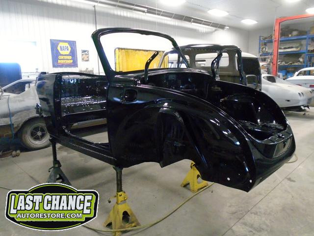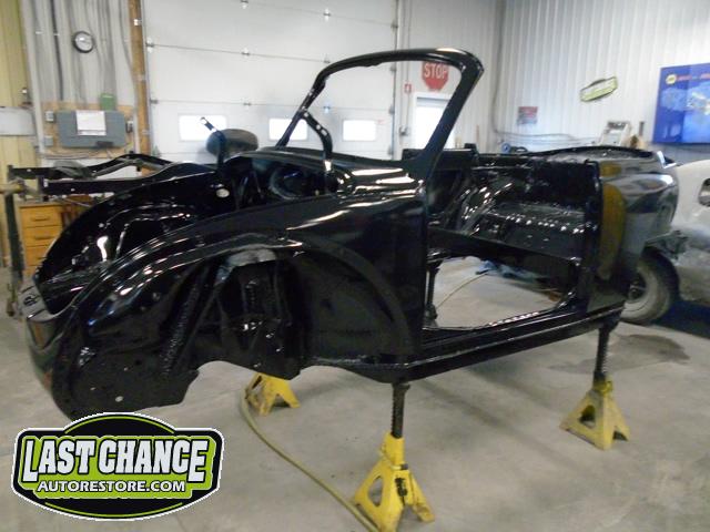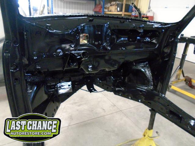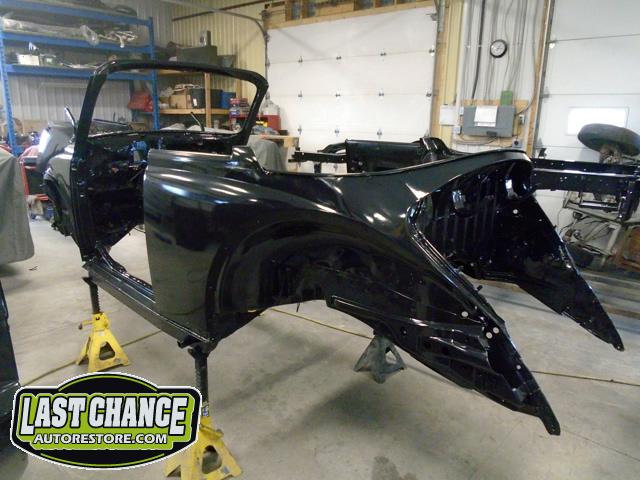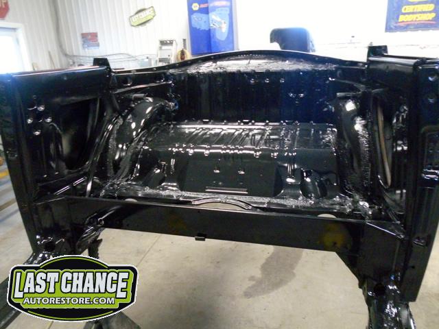 With all of the old factory paint sanded and removed from all areas of the body, it was washed and wiped down with a special degreaser and cleaning solution before the complete body received two coats of a special two part black epoxy metal sealer (to protect the complete car from future rust).