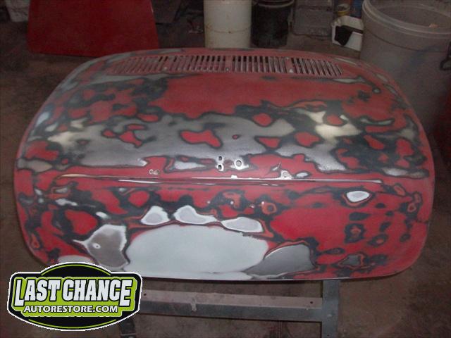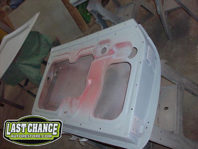 Our next step was the smoothing, priming and block sanding of the body, doors, hood and engine lid. After numerous hours of sanding, the shell was painted!