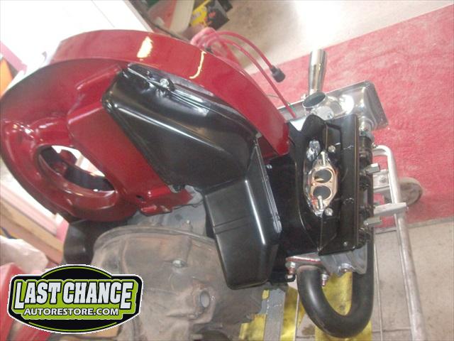 The replacement engine was rebuilt. We made several upgrades along the way. The motor was installed to the transmission/chassis. The next step was to set the body back on the chassis.