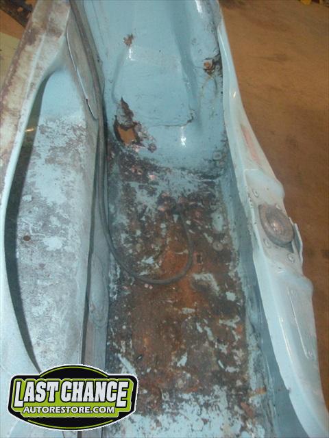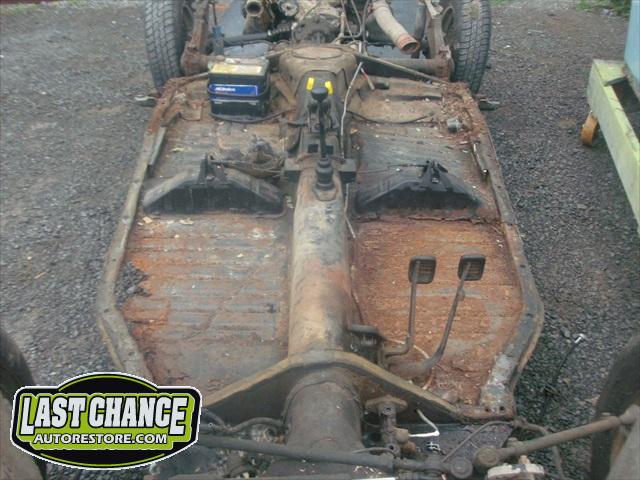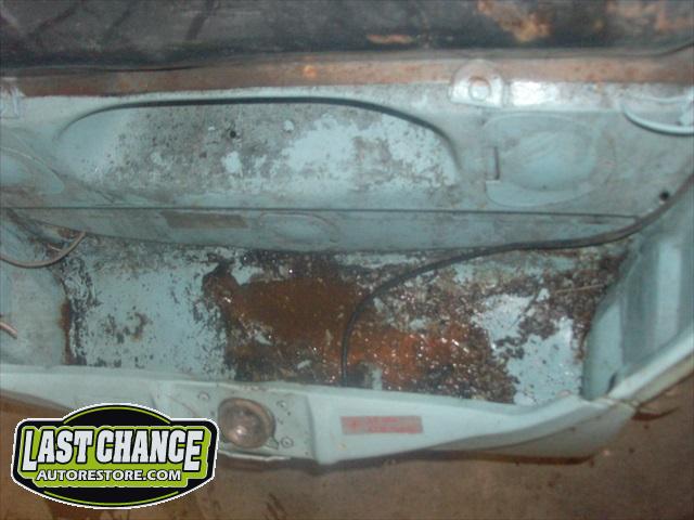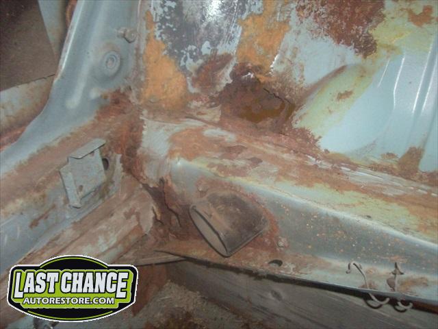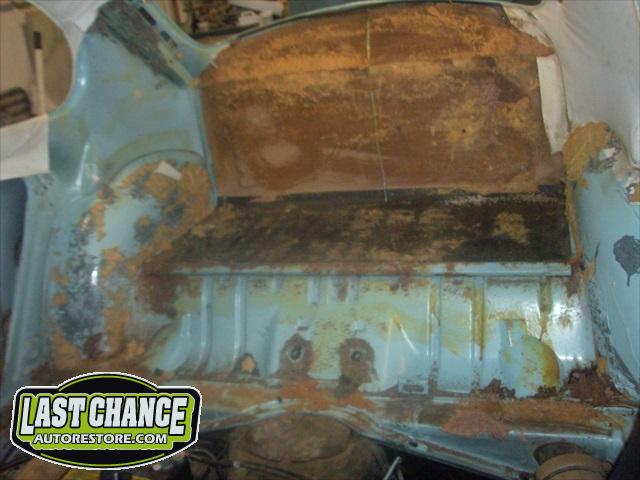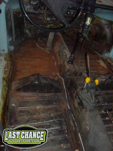 The optional gas heater, spare tire and glass was also removed. The front bucket seats and two piece rear bench seat was also removed. Once the carpet was lifted, we were able to see the excessive rust and rust holes.