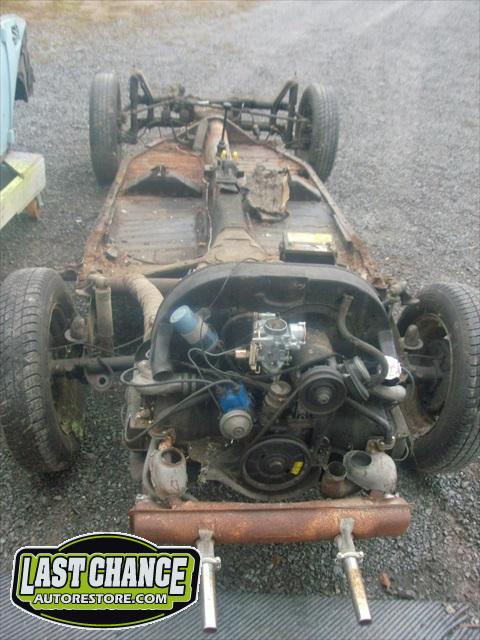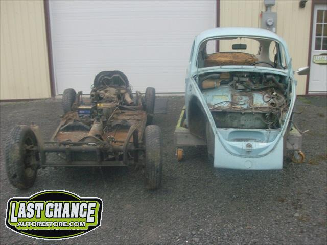We lifted the body up off of the chassis and it clearly shows us that both heater channels (the main structural sections of a VW Bug) are badly rusted out on both sides (quite common on VW Beetles).