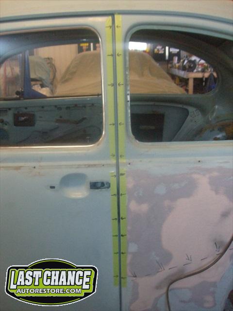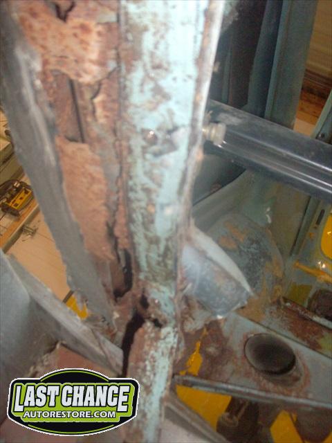 The heater channels down both the driver and passenger sides are badly rusted with very little metal holding the front of the body to the rear section of the body together. The large gaps between both doors and quarter panels (highlighted with green masking tape with black arrows) shows how much the body is pulling away.