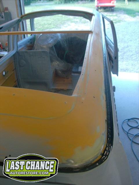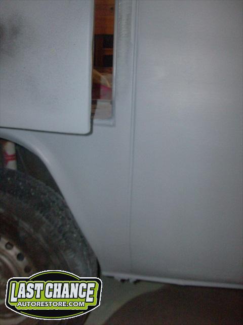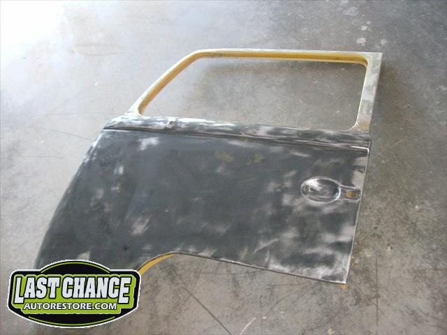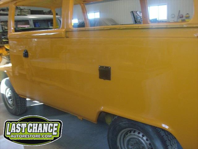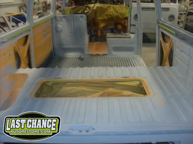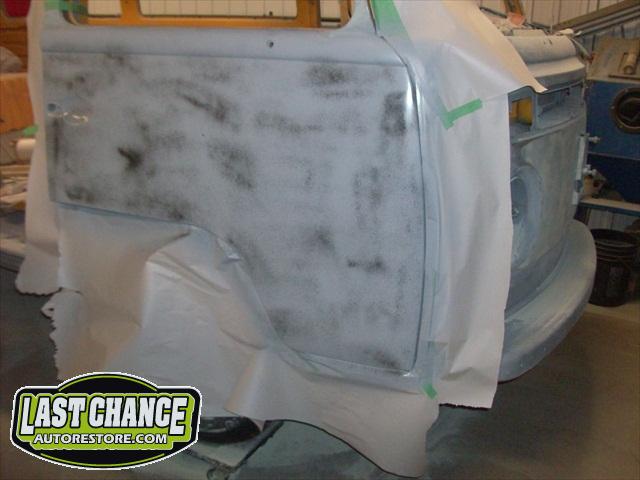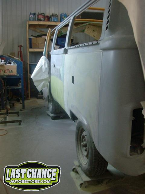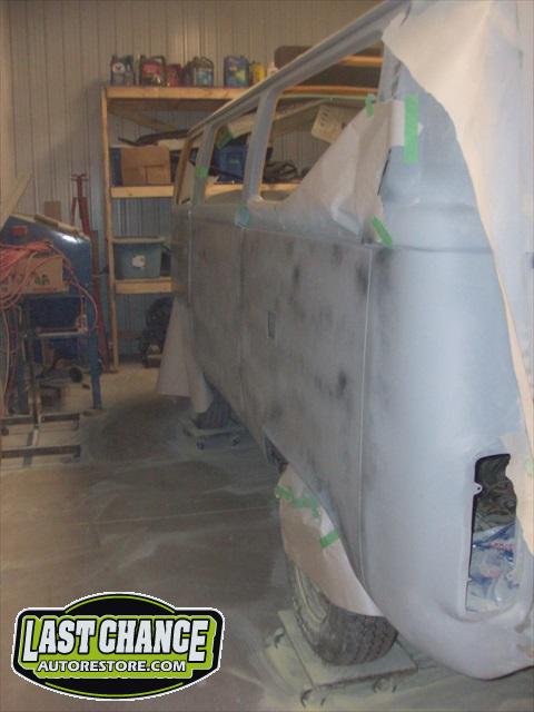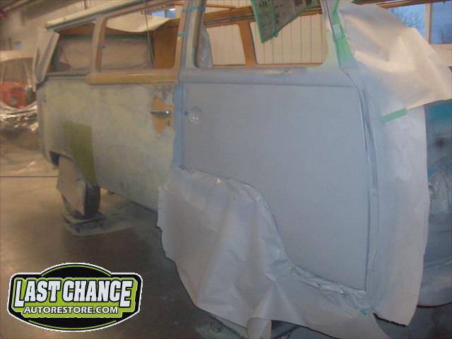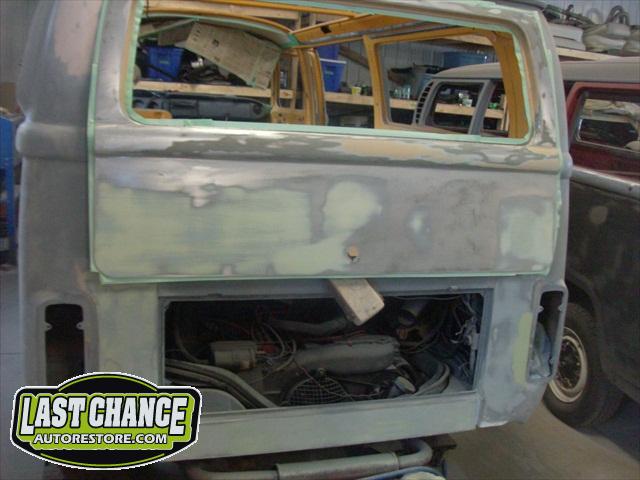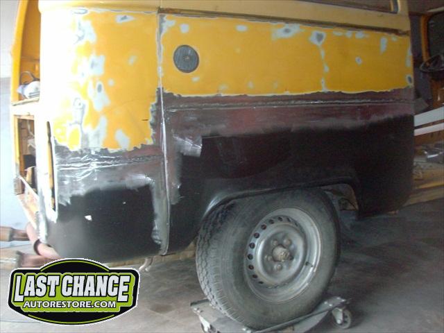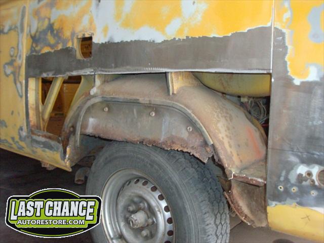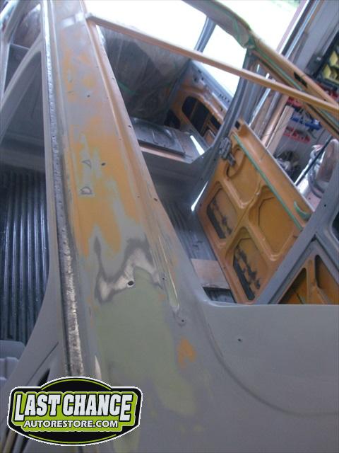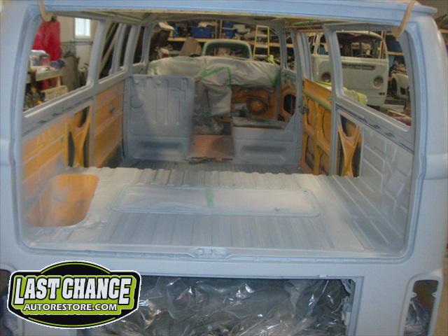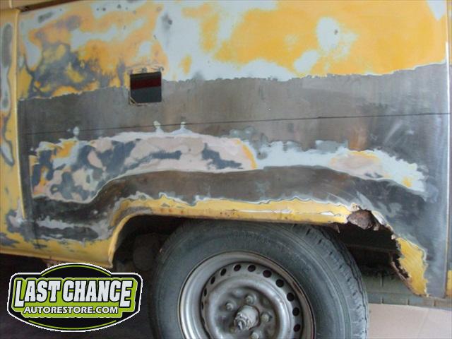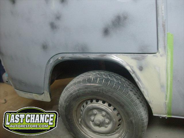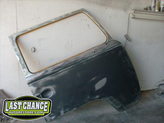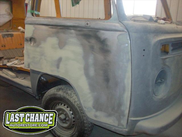 With all of the fabrication complete, we turned our attention to repair the doors. The two front doors received complete door skins, the sliding door was repaired and the rusted out rear tailgate was replaced with an almost rust free one from the Southern U.S.