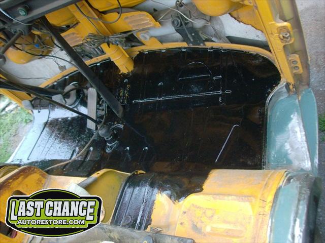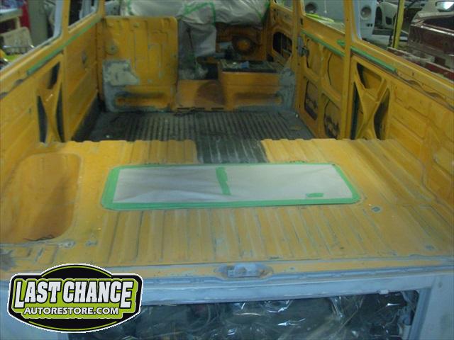 We sanded several layers of paint off the lower exterior panels and viewed excessive use of body fillers used to fill in all of the rust holes. There were also surprises along the way. We found "stick on exhaust foil tape" covering rusted out structural areas and painted over with a brushed on undercoating material.